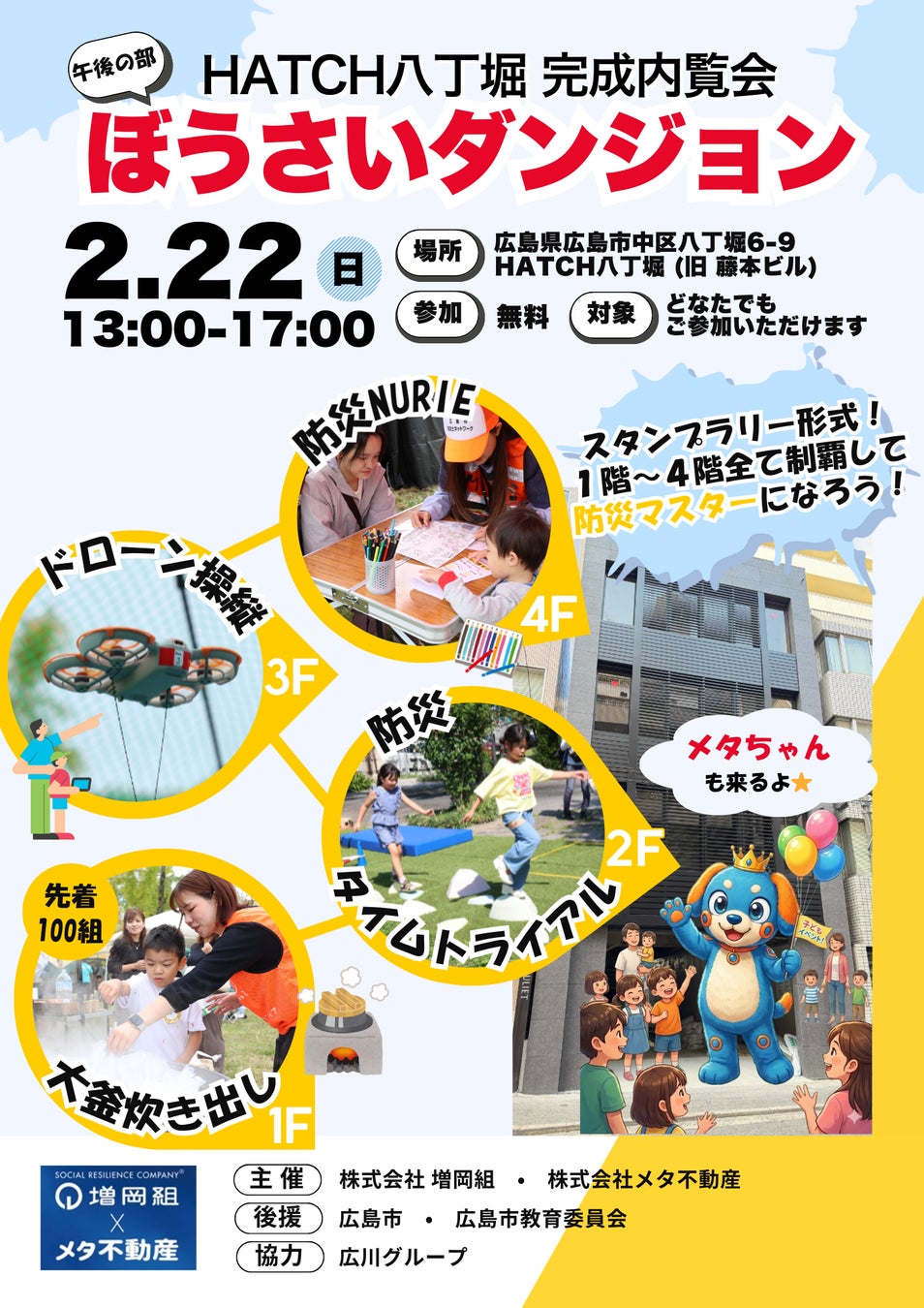 西日本初、国土交通省認定モデル事業築古ビル再生「HATCH八丁堀」完成内覧会を開催 ― 子ども向け防災体験イベント「ぼうさいダンジョン」同日開催 ―