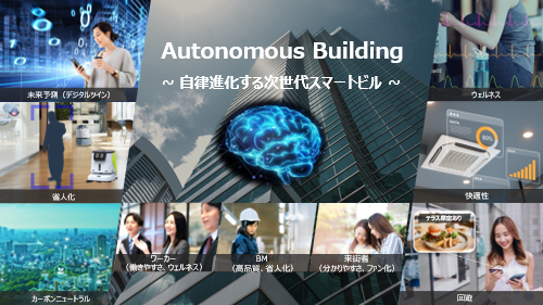 「Autonomous Building」は、AIやIoT、ビルOSを活用してビル管理業務のさまざまなデータをリアルタイムかつ総合的に管理・連携させながら、外部アプリケーションの活用により機能を拡張していくことで自律的に進化し続ける、次世代のスマートビルです。