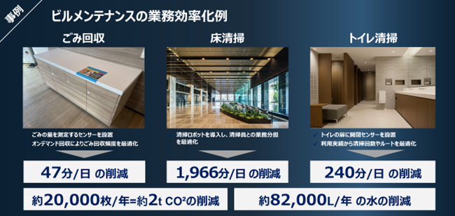 2023年から実施している東京ポートシティ竹芝での実証では、主に清掃業務の最適化を進めてきました。例えばごみの回収では、ごみ箱に捨てられたごみの量が70%に達すると清掃員に通知される仕組みを導入して、オンデマンドでの回収に切り替えることで回収回数を約65%削減し、1日当たり約47分の業務時間を削減しました。これにより、年間で約2t分のCO2に相当する約2万枚のごみ袋の削減につながっています。また、床清掃に清掃ロボットを活用することで清掃員との役割分担を最適化し、1日当たり約1,966分の業務時間を削減しました※。さらに、トイレの清掃業務では従来の定時巡回方式ではなく、利用実績に応じて清掃回数やルートを最適化する仕組みを導入することで、1日当たり約240分の業務時間を削減しました。