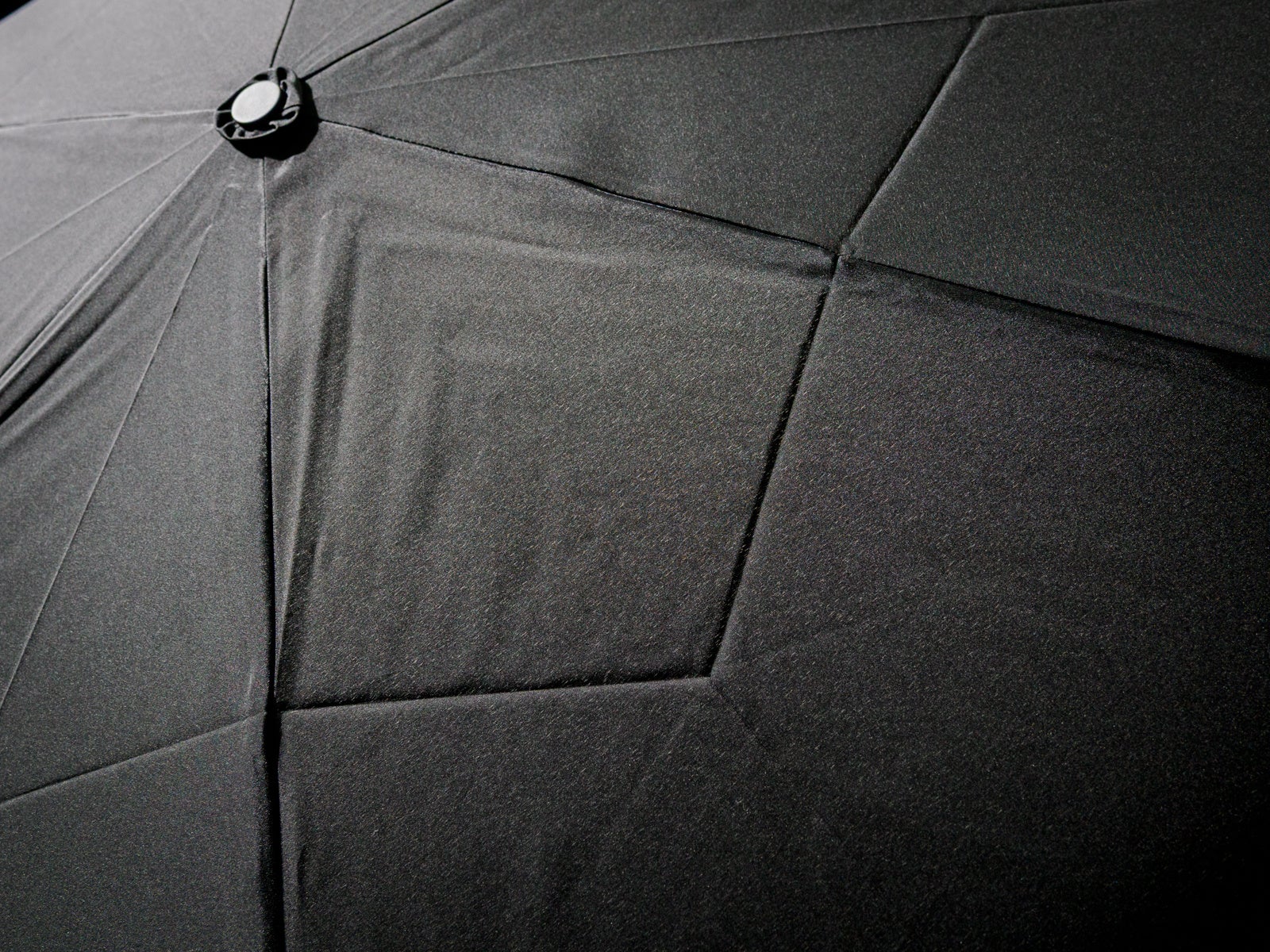 「たたもうとすると、もたついてぐちゃぐちゃになる」というストレスを解消するため、生地そのものに特殊な「熱加工」を施しました。傘を閉じるとプリーツ(折り目)に合わせて生地がパタパタと規則正しく整うため、いつでもキレイに、サッとたたむことができます。裏面に樹脂シートを貼るタイプの形態安定とは異なり、生地そのものに加工しているため、重くなったり、使っているうちに剥がれたりする心配もありません。