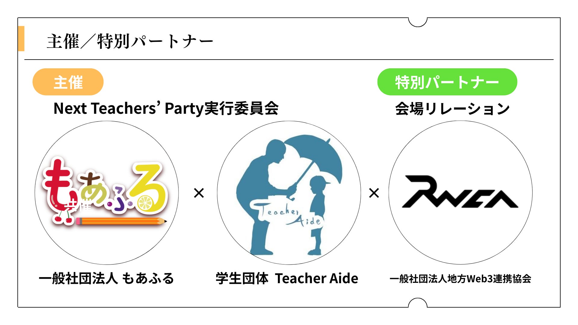 一般社団法人もあふると学生団体TeacherAideからなる「Next Teachers' Party実行委員会」は、2026年2月24日(火)に開催する新人教員応援イベント『Next Teachers' Party 2026』において、「一般社団法人地方Web3連携協会」が特別パートナーとして参画していることをお知らせいたします。