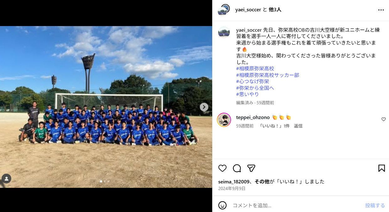 「このたびは相模原弥栄高校サッカー部への多大なご支援、本当にありがとうございます。弥栄高校から社会にでて活躍する卒業生の存在は、生徒たちにとって大きな励みになります。