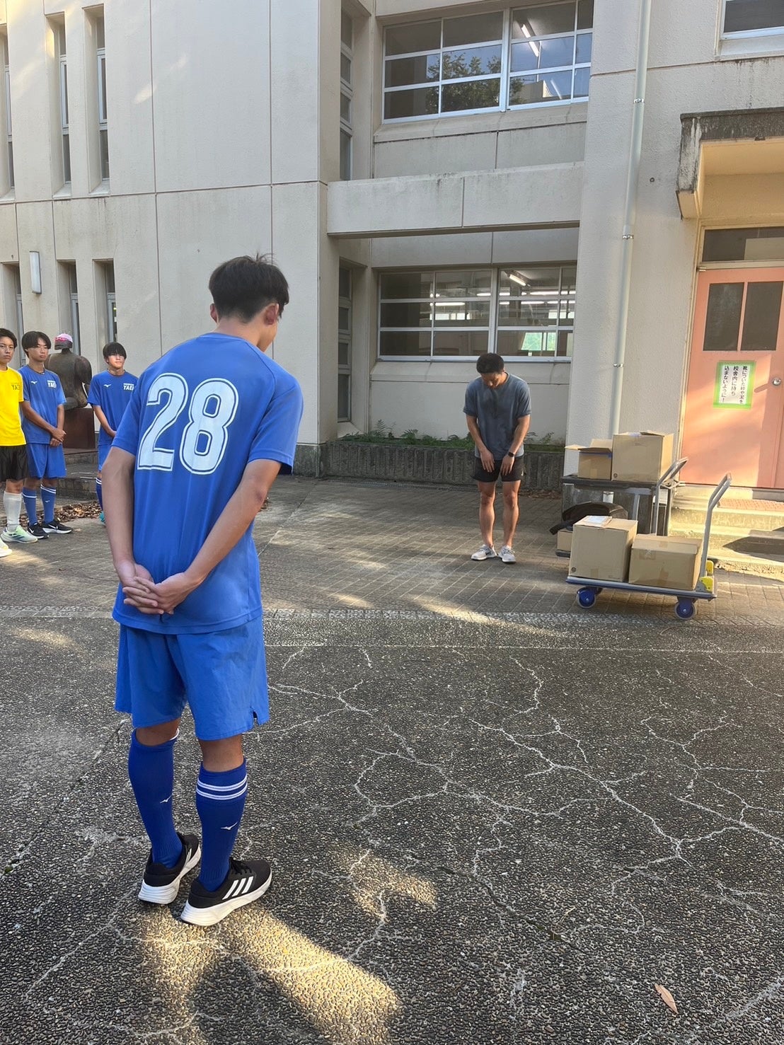 同校サッカー部OBである吉川は、グラウンドを訪れ、母校への恩返しとして現役選手一人ひとりに新ユニフォームを贈呈。選手たちは真新しいユニフォームに袖を通し、秋季大会に向けて気持ちを新たにスタートしました。