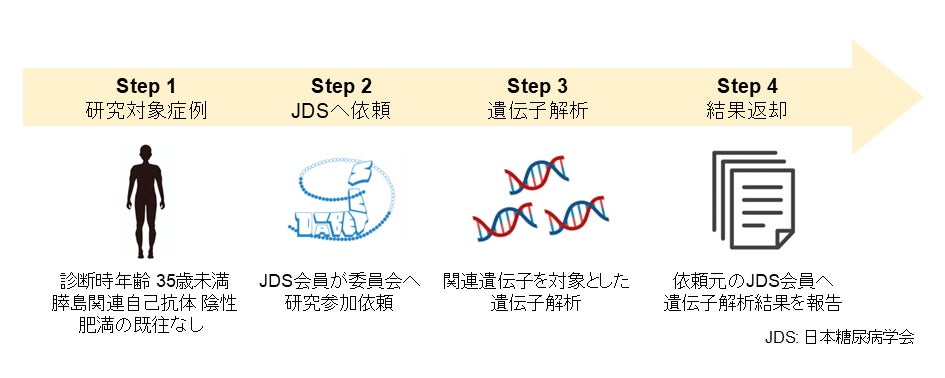 このような背景から、日本糖尿病学会(JDS)は「単一遺伝子異常による糖尿病の成因や診断、治療に関する調査研究委員会」(委員長:稲垣暢也、中央事務局:京都大学大学院医学研究科 糖尿病・内分泌・栄養内科学)を設置しました。そして2019年以降、日本糖尿病学会の会員と協力し、単一遺伝子糖尿病が疑われる症例に対して遺伝子解析を行う全国規模の研究を進めてきました。