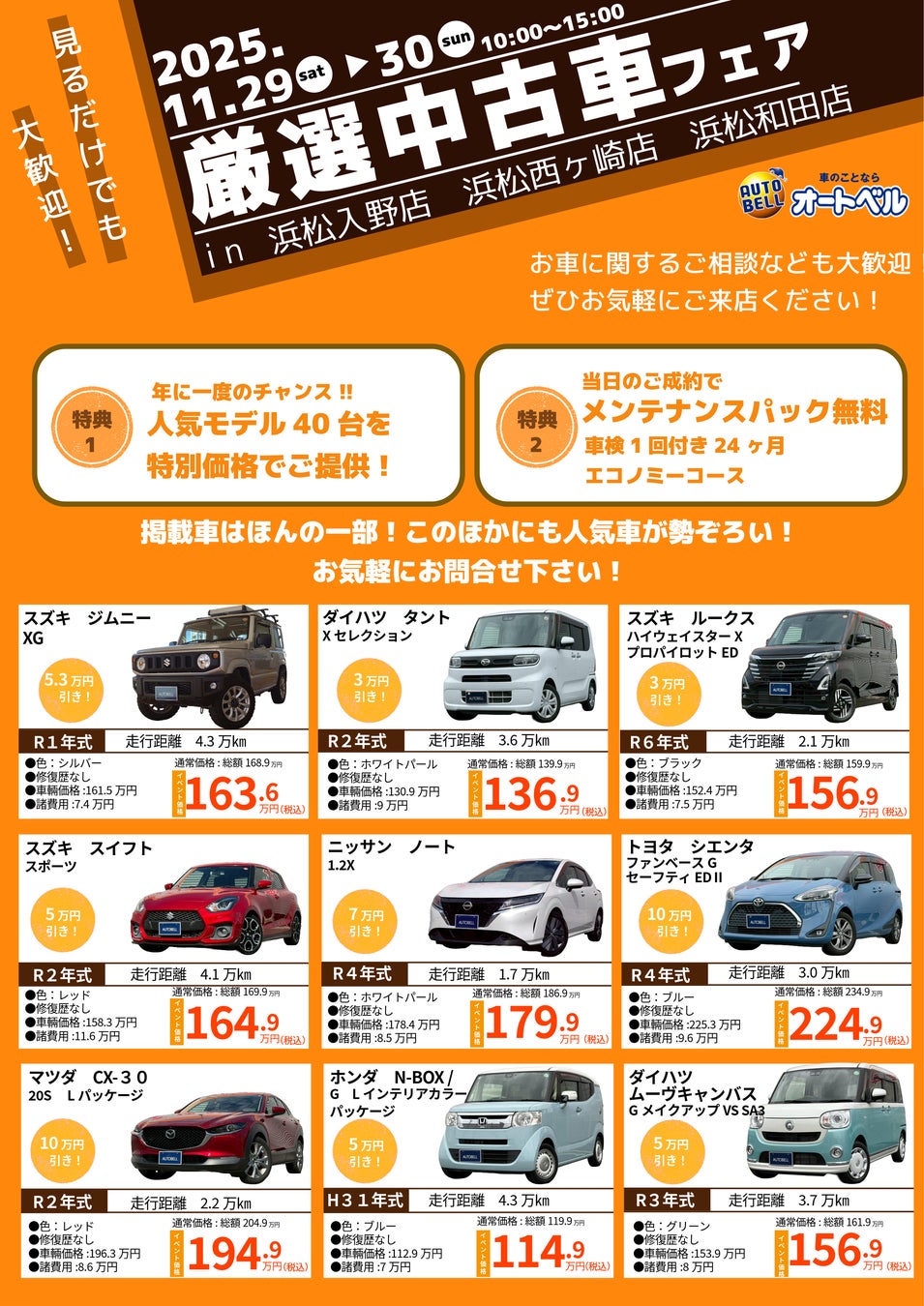 イベント開催に際して、浜松3店舗で「厳選中古車フェア」も同時開催。人気車種を中心に、お値打ち価格で展示販売。当日ご成約の方には、「メンテナンスパック無料付帯」の特典もご用意しています。