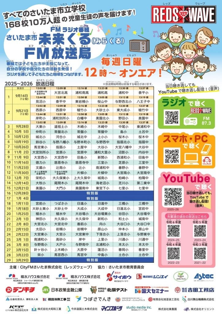 『さいたま市 未来くるFM放送局』は、さいたま市の子どもたちが自ら考え、企画し、発信するラジオ番組です。学校生活のこと、地域のニュース、将来の夢など、子どもたちのリアルな声を地域に届けることを目的としています。