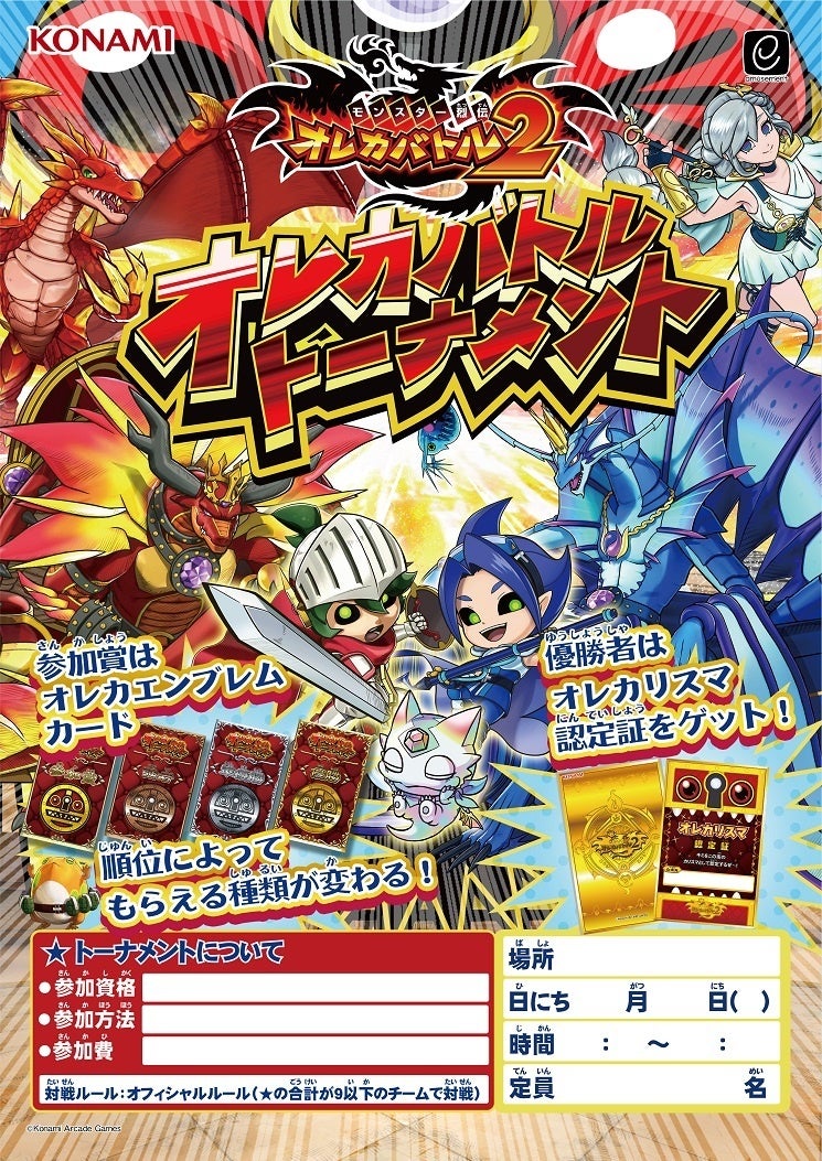 株式会社コナミアーケードゲームスは、アミューズメント施設向けビデオカードゲーム『モンスター烈伝 オレカバトル2(モンスターレツデン オレカバトルツー)』を使用した公式大会「オレカバトルトーナメント」を10月11日(土)から順次開催することをお知らせします。