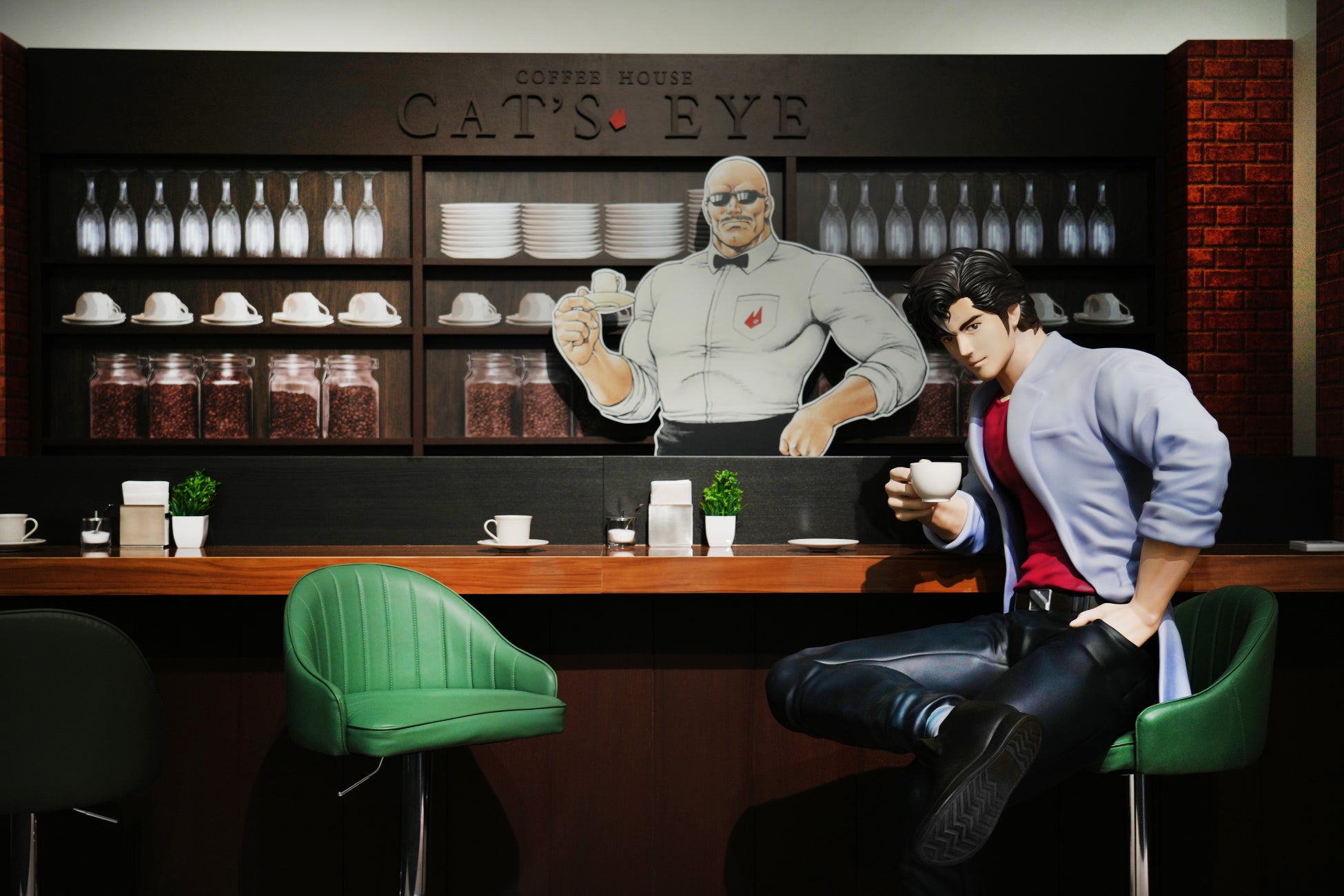 海坊主が営む喫茶キャッツアイの店内では、等身大の冴羽獠がお出迎え!!