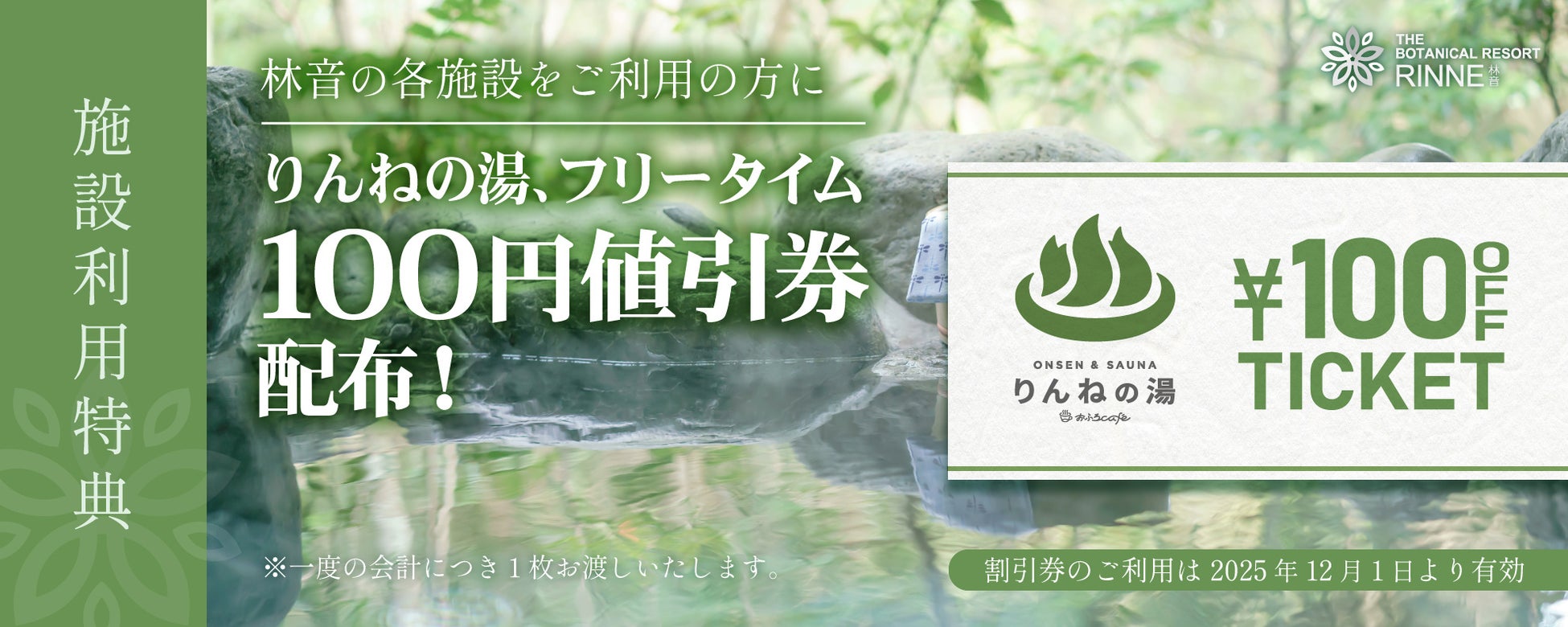 林音(リンネ)各施設ご利用で、次回使えるりんねの湯フリータイム100円引き券をプレゼント※します。