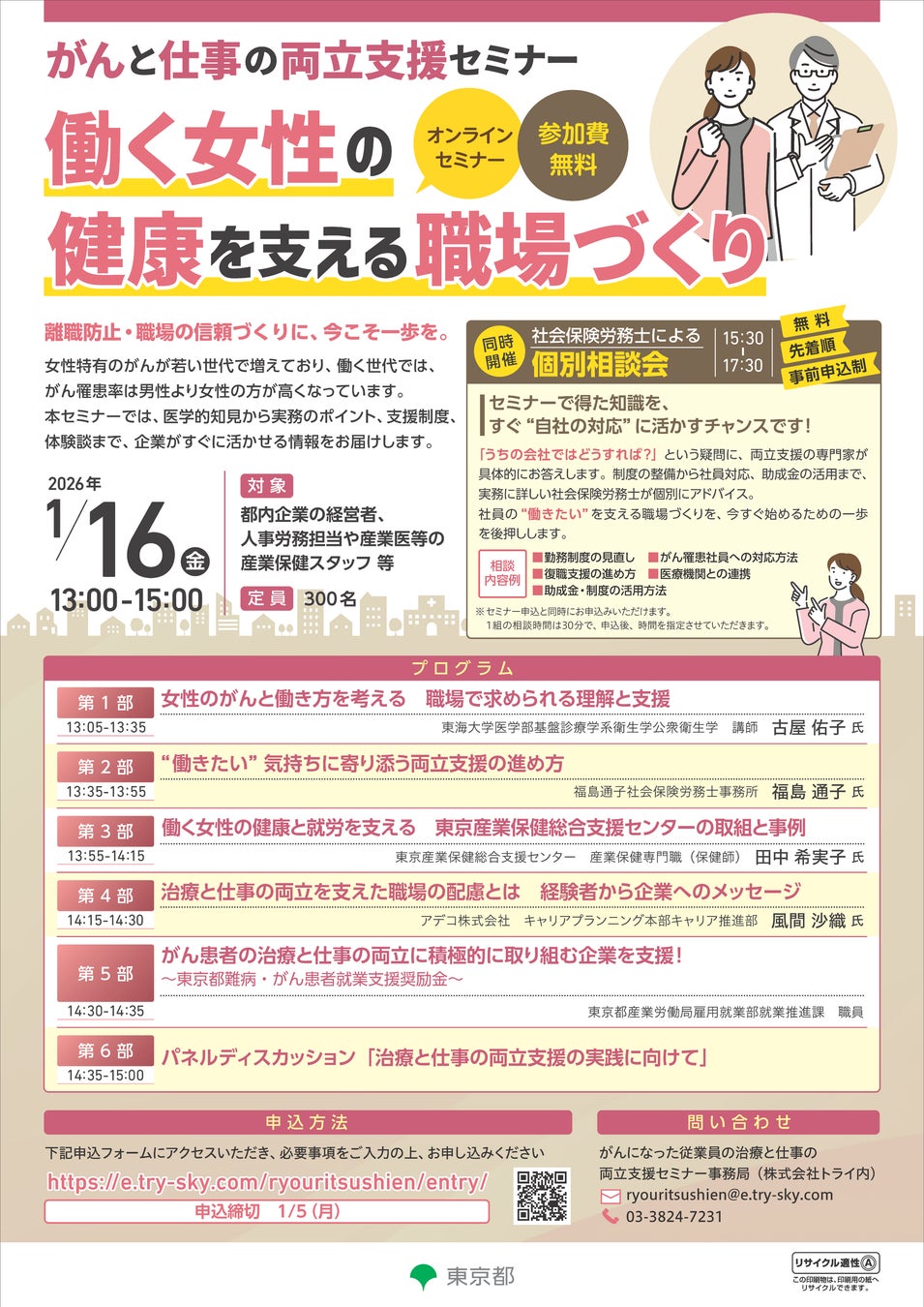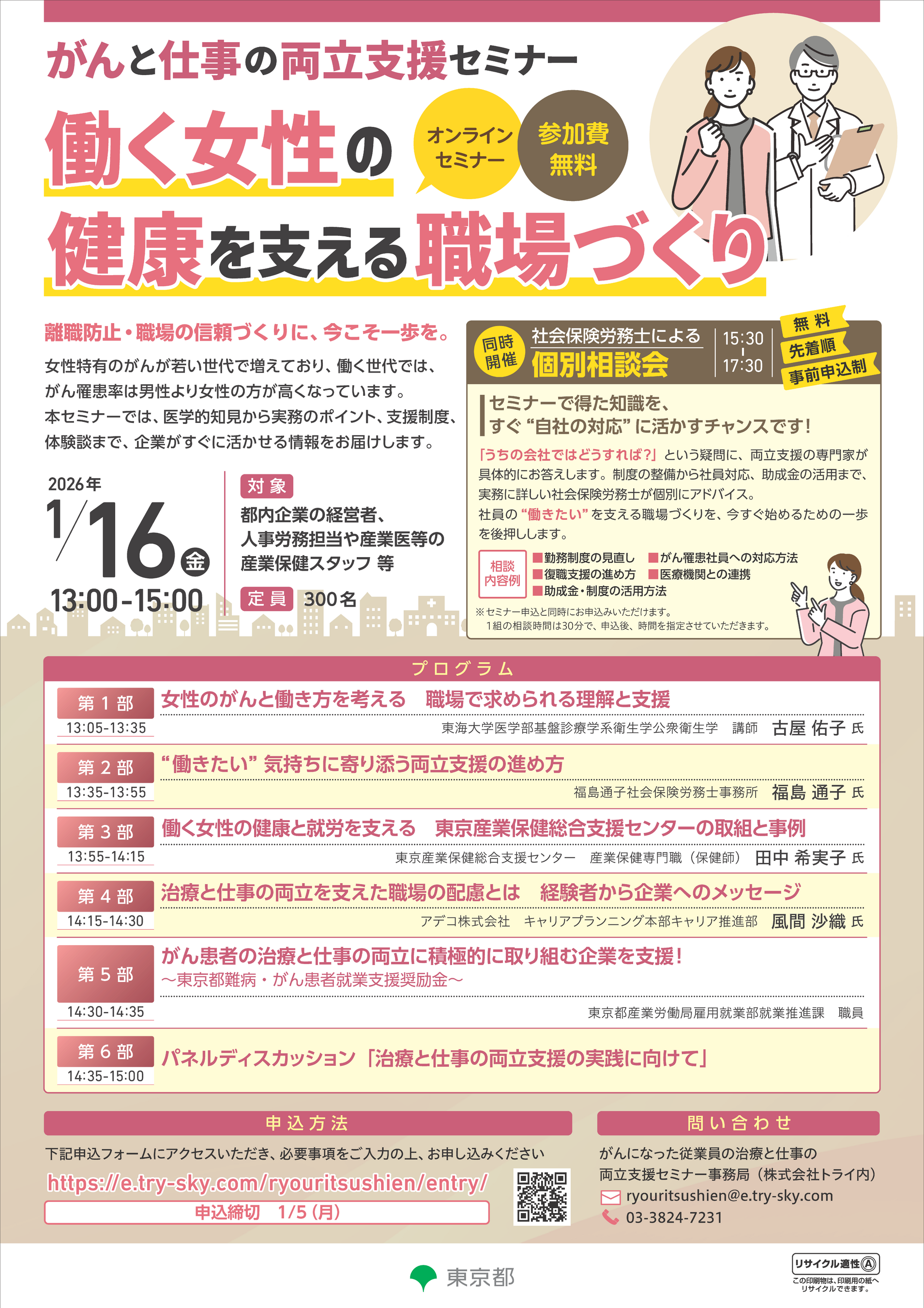 東京都は、「東京都がん対策推進計画」に基づき、がん患者の就労支援の推進に取り組んでいます。この度、企業経営者や人事労務担当者等を対象に、女性のがんと仕事の両立支援をテーマとしたオンラインセミナーを開催します。