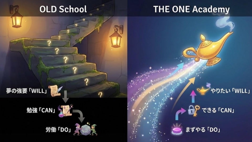 従来の教育は「夢を持て(WILL)」→「勉強しろ(CAN)」→「社会に出ろ(DO)」という順序を強いてきましたが、経験のない若者に夢を問うのは酷であり、停滞の原因です。 我々は人間工学に基づき、このフローを完全に真逆にします。
