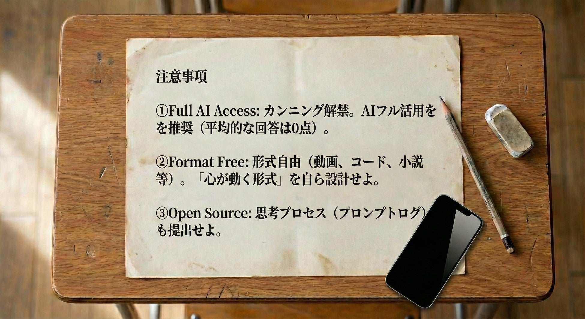 平均からの脱却(Beyond Average): AIが出力する「もっともらしい回答」は0点とします。AIという巨人の肩に乗り、そこから「あなた自身の思考(OS)」で何を語れるか。その一点を問います。