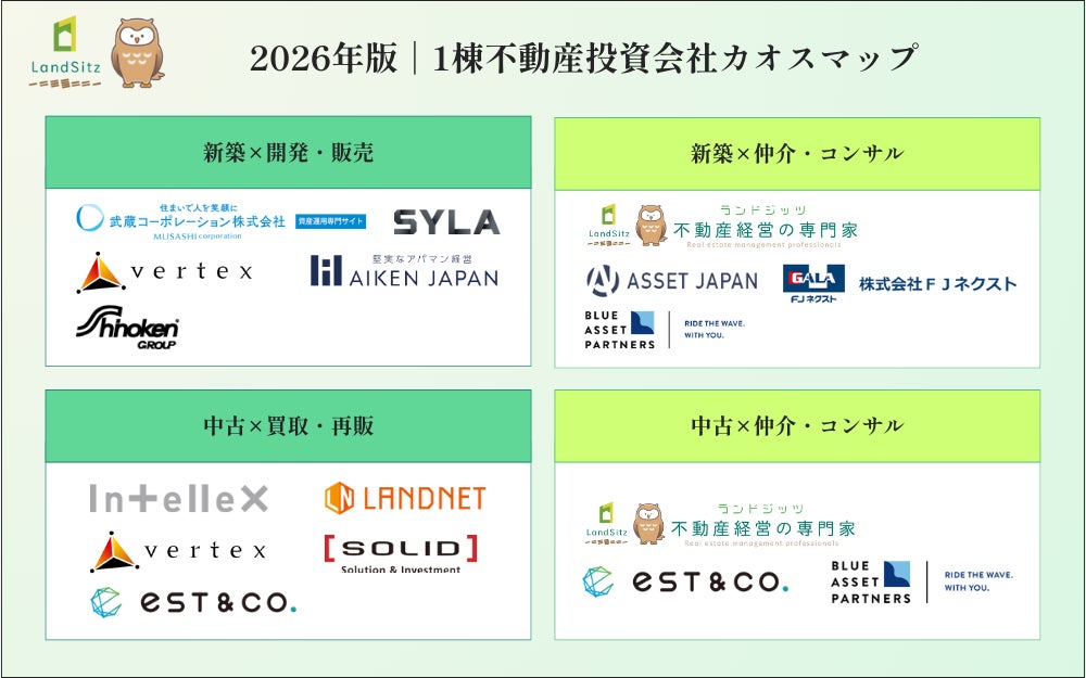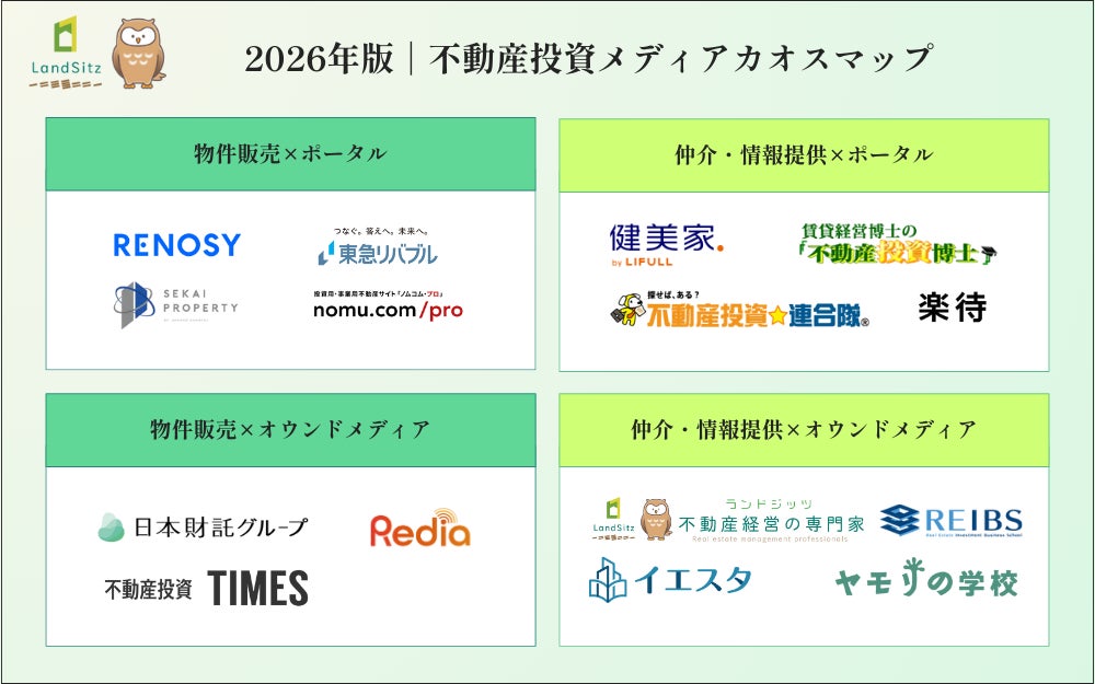 不動産投資に関する情報を発信するオウンドメディア「不動産投資の裏側を知る教科書」(運営:株式会社LandSitz、https://landsitz.biz/)は、不動産投資業界の全体像を把握しやすくするため、「2026年版|1棟不動産投資会社カオスマップ」と「2026年版|不動産投資メディアカオスマップ」の2種類を作成し、公開いたしました。