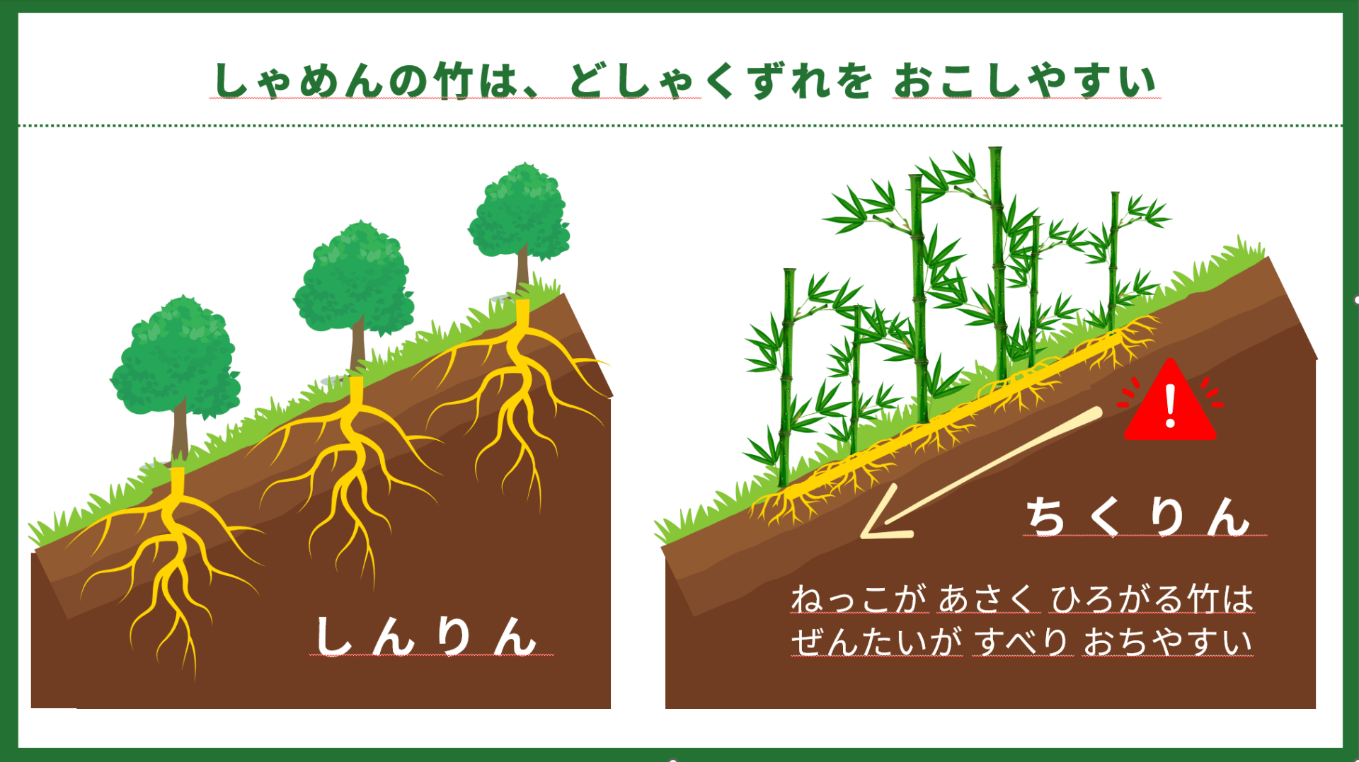 災害の抑制: 根の浅い竹林が引き起こす土砂災害のリスクを軽減します。