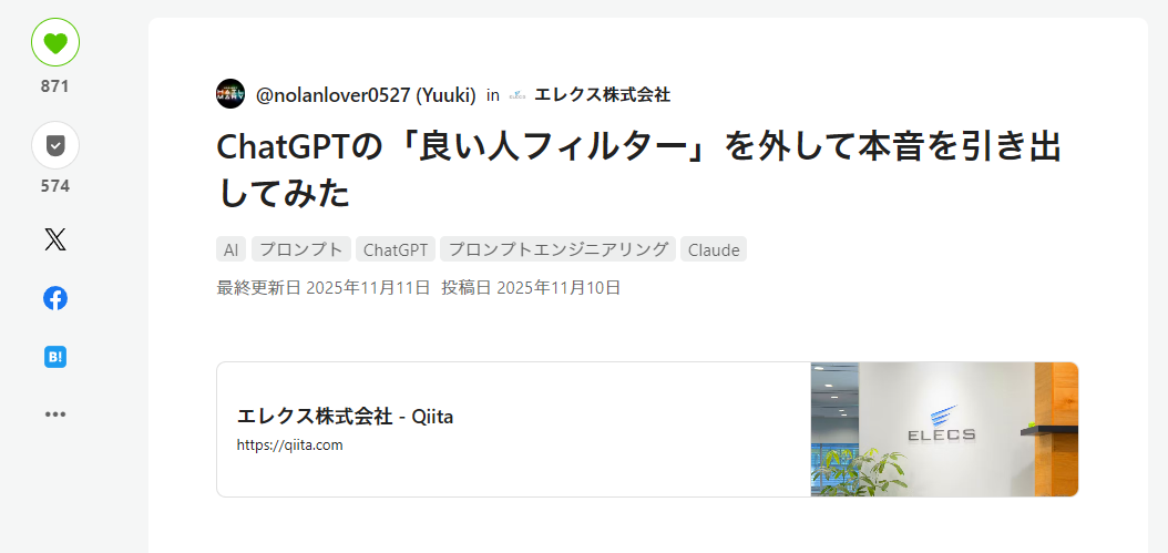 "良い人フィルター"を外したプロンプトが話題に ― Qiitaで850いいね突破・月間1位獲得