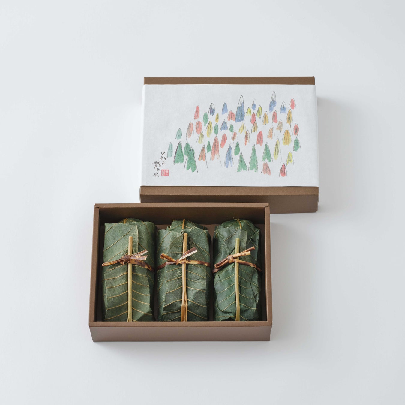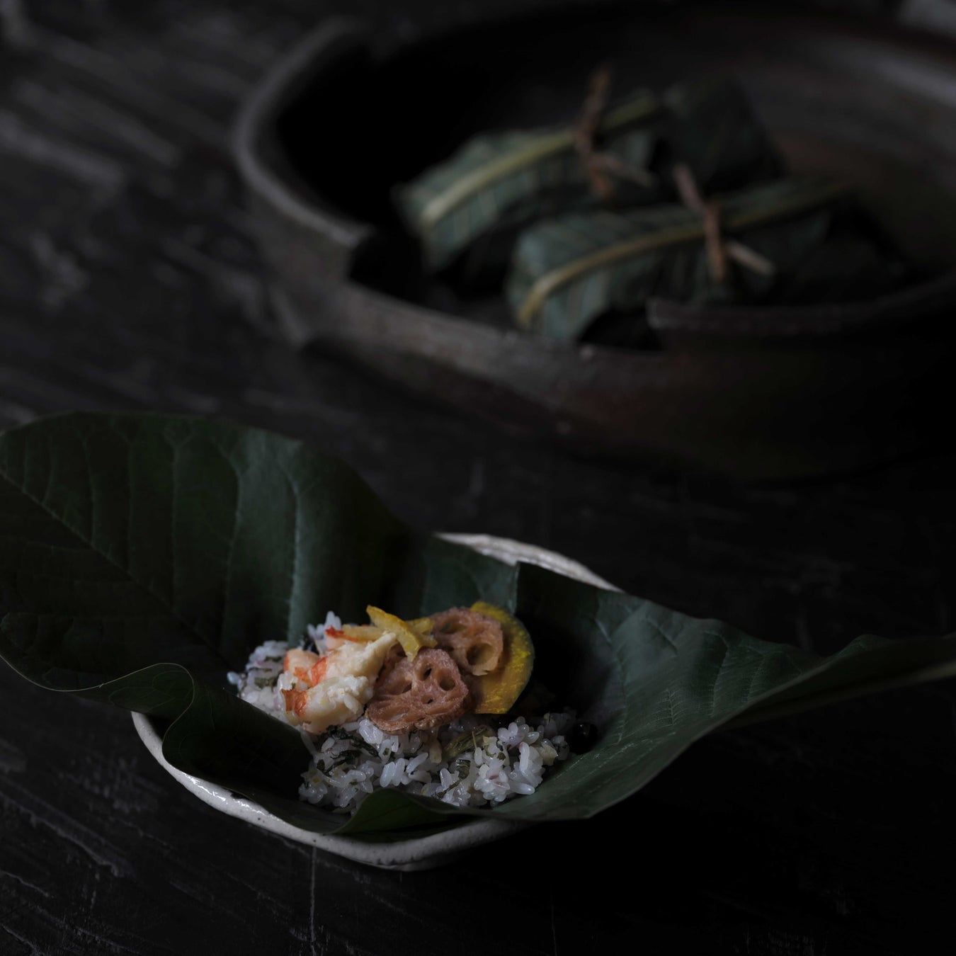 “海老とすぐき” “牛山椒煮” “ばい貝”、それぞれに個性ある味わいを風味豊かな飯蒸しに仕立て、香り高い朴葉で丁寧に包みました。開いた瞬間に広がる朴葉の清々しい香りと、彩り豊かな具材、もちもちとしたおこわの食感が絶妙な調和を生み出す一品です。