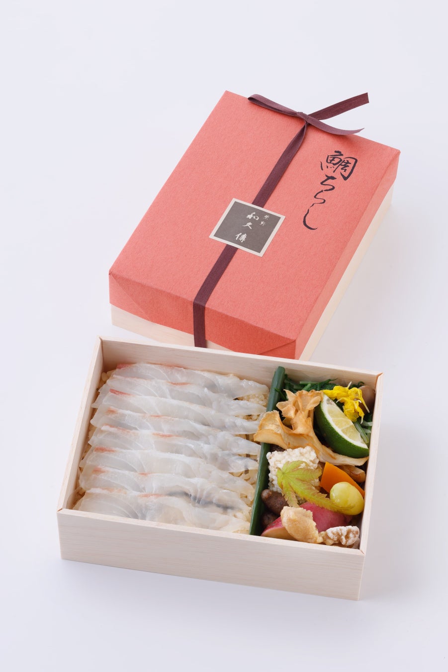ほんのりとまろやかな風味の黒寿司に、新鮮な鯛の薄造りを敷き詰めた、和久傳自慢の鯛ちらし。仕上げの土佐醤油が上品な風味を引き立てます。