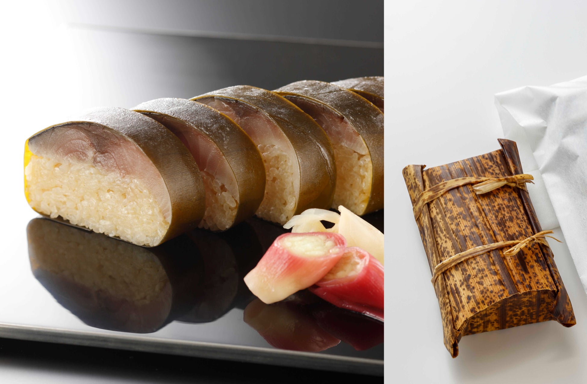 脂がのった鯖を塩と酢で丁寧に締め、肉厚ながらも、しっとりとした上品な口当たりに仕上げました。ごまかしのきかないシンプルさの中に、職人の技が凝縮された逸品です。爽やかな香りの茗荷を添え、紅葉狩りや秋の行楽にもおすすめです。