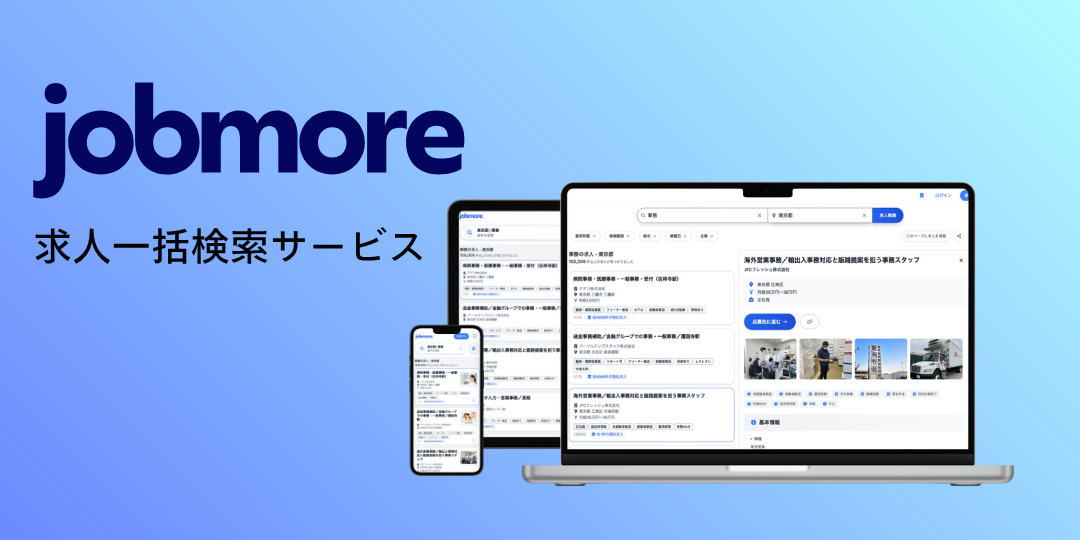 「ジョブモア」は、複数の求人サイトに掲載されている求人情報をまとめて検索できるアグリゲート型の求人サイトです。正社員・パート・アルバイト・派遣・契約社員・業務委託など多様な雇用形態の求人を掲載しており、勤務地・職種・給与などの条件で簡単に検索することができます。