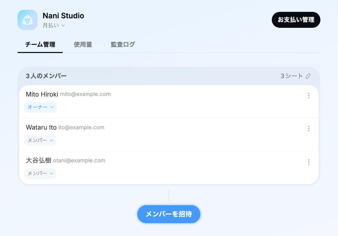 専用のチームダッシュボードから、メンバーの招待や権限管理など、チームの管理に必要な機能を簡単に操作できます。