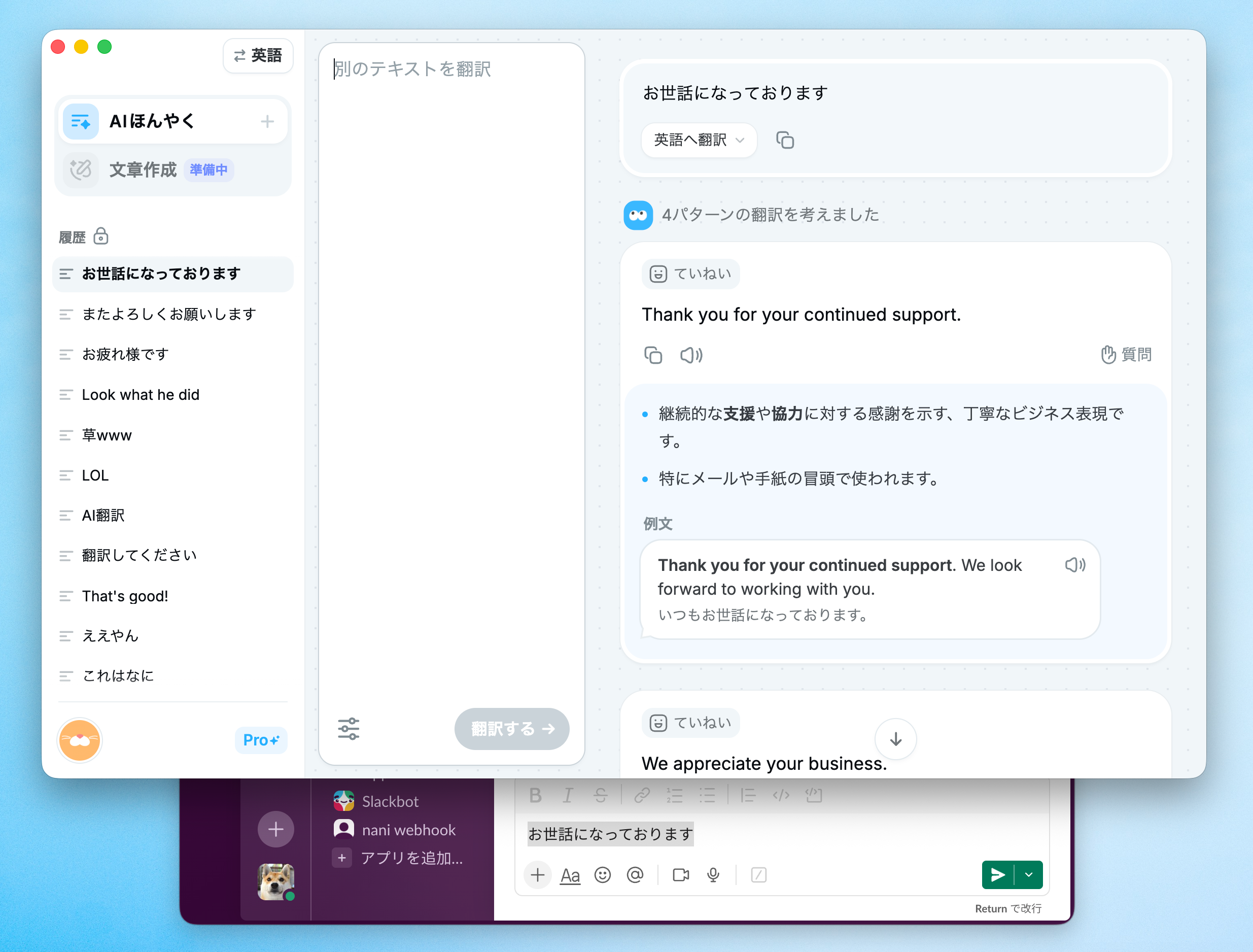 従来の“1入力=1訳”の翻訳ツールとは異なり、複数の言い回しの提案に加え、AIによりニュアンスや使い分けの解説までチェックすることができます。翻訳後には、原文と同じ言語でAIにより返信文を作成することもできます。