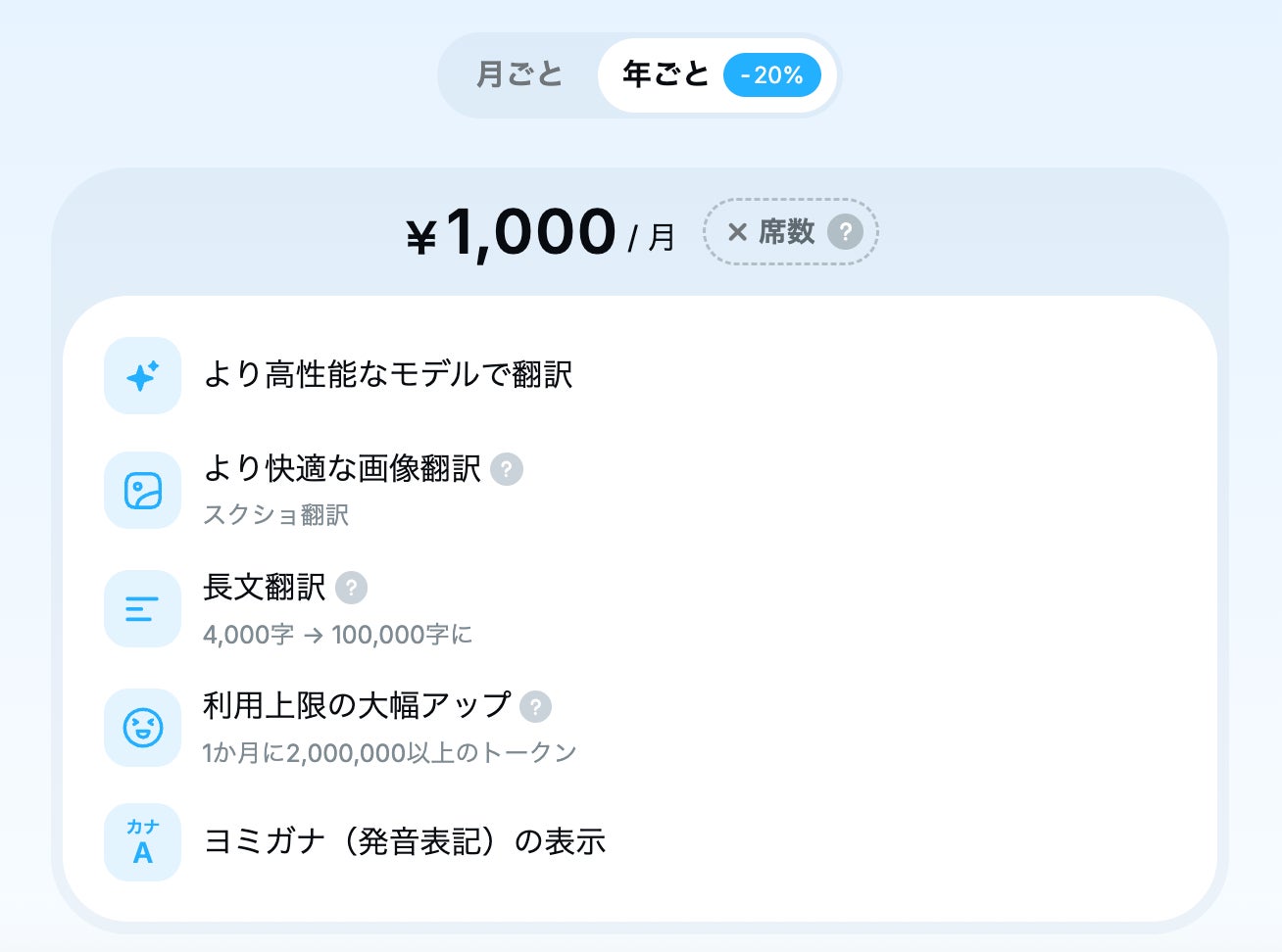 有料プラン(PRO):上限を大幅に引き上げ / 高精度モデルの利用 / ヨミガナ表示 / 長文翻訳 / 画像内容の翻訳