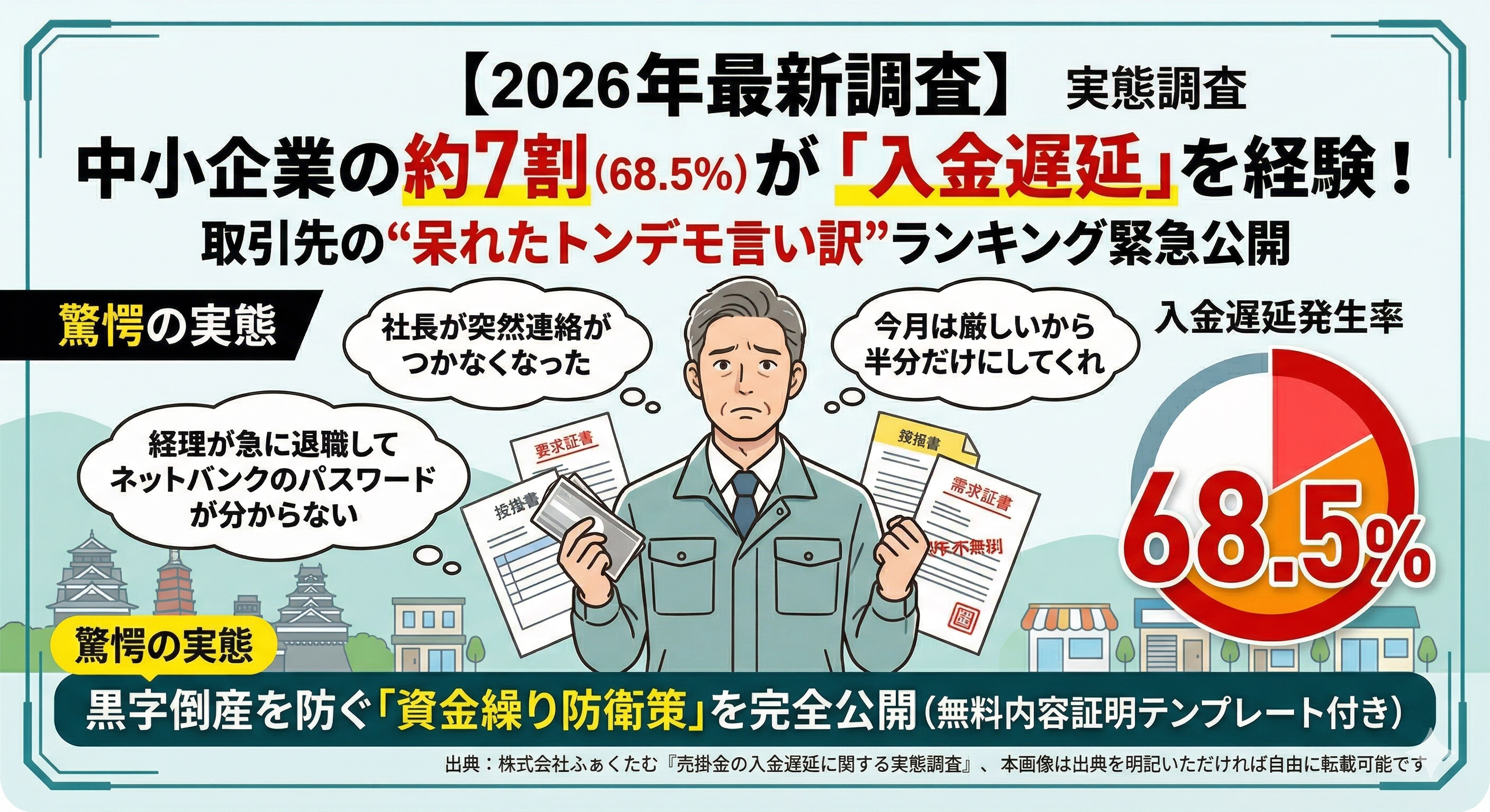 【2026年最新調査】中小企業の約7割(68.5%)が「入金遅延」を経験!取引先の“呆れたトンデモ言い訳”ランキングも発表。〜黒字倒産を防ぐ資金繰り防衛策とは?〜