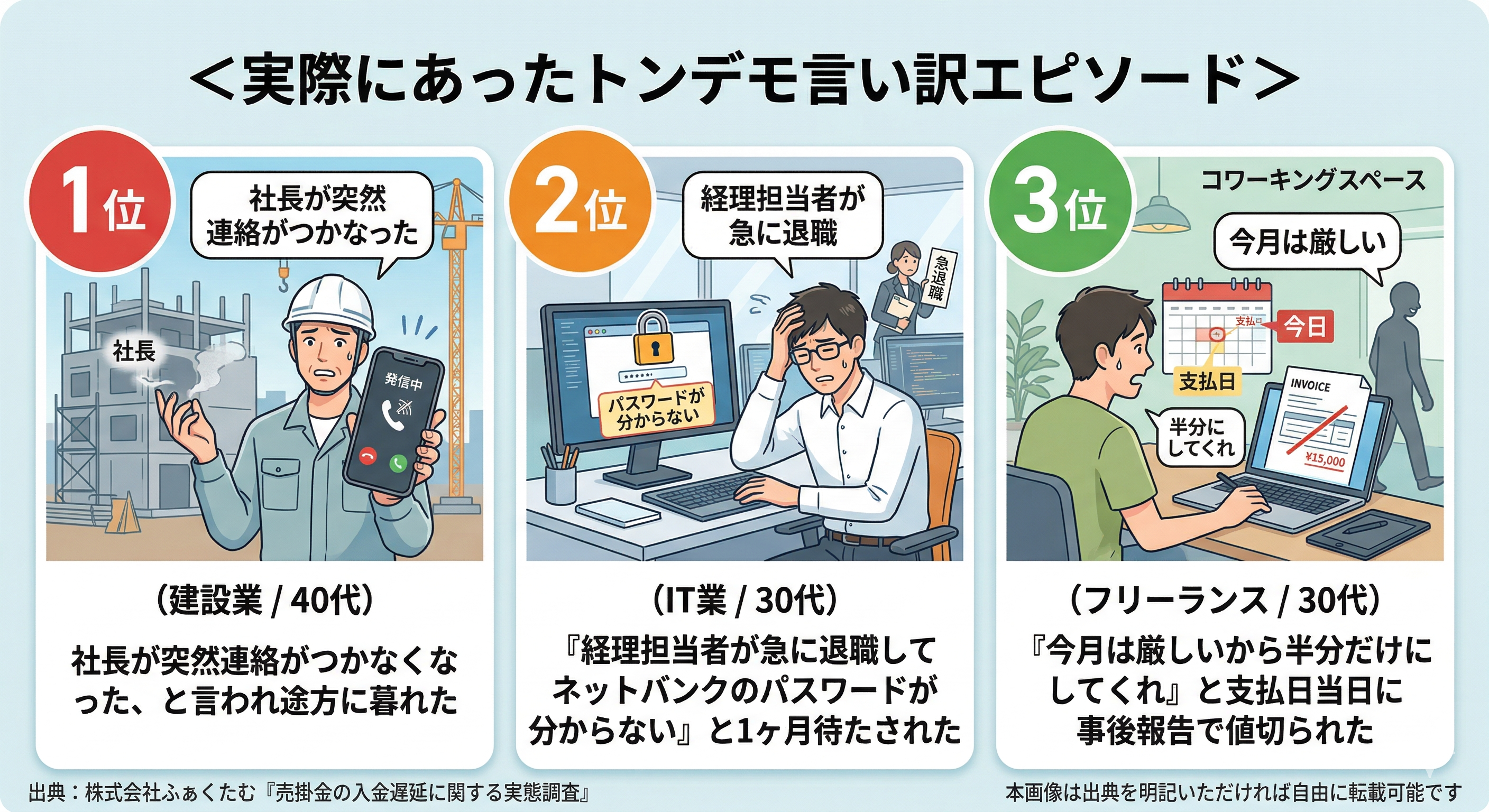 入金遅延の理由、第1位は「担当者の失念(42.1%)」。中には「社長が雲隠れした」「経理が急に辞めた」などの呆れた言い訳も。
