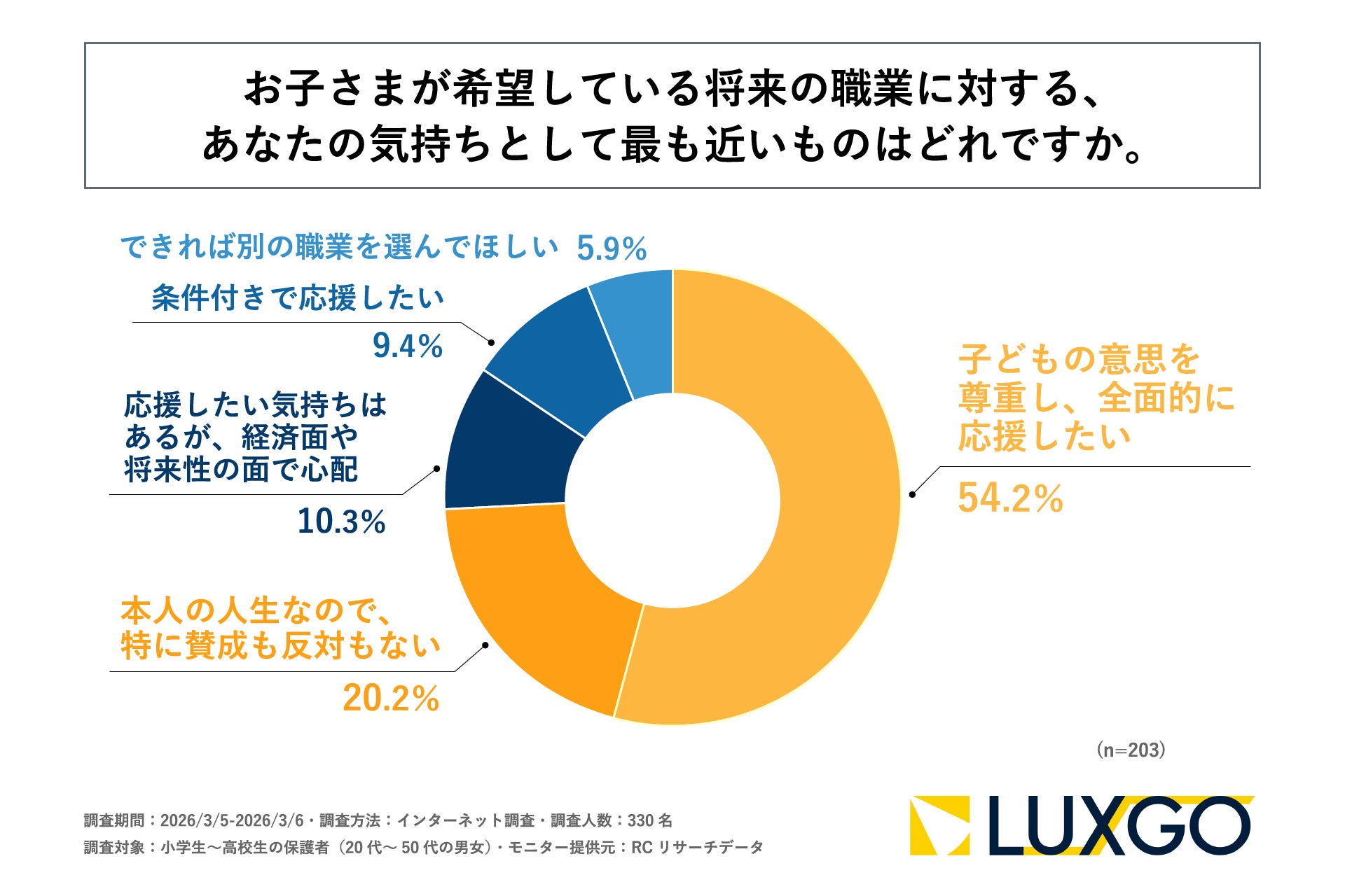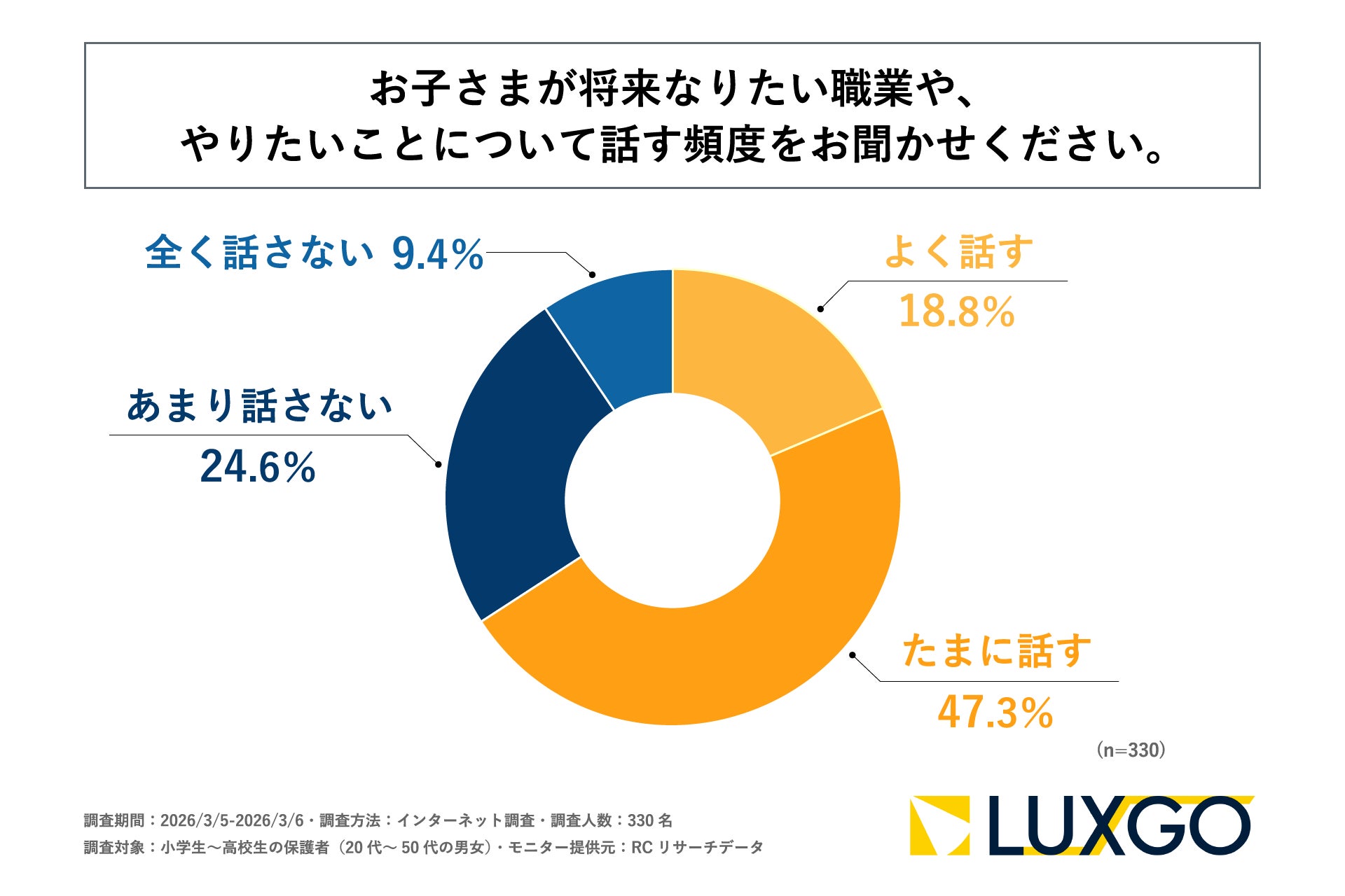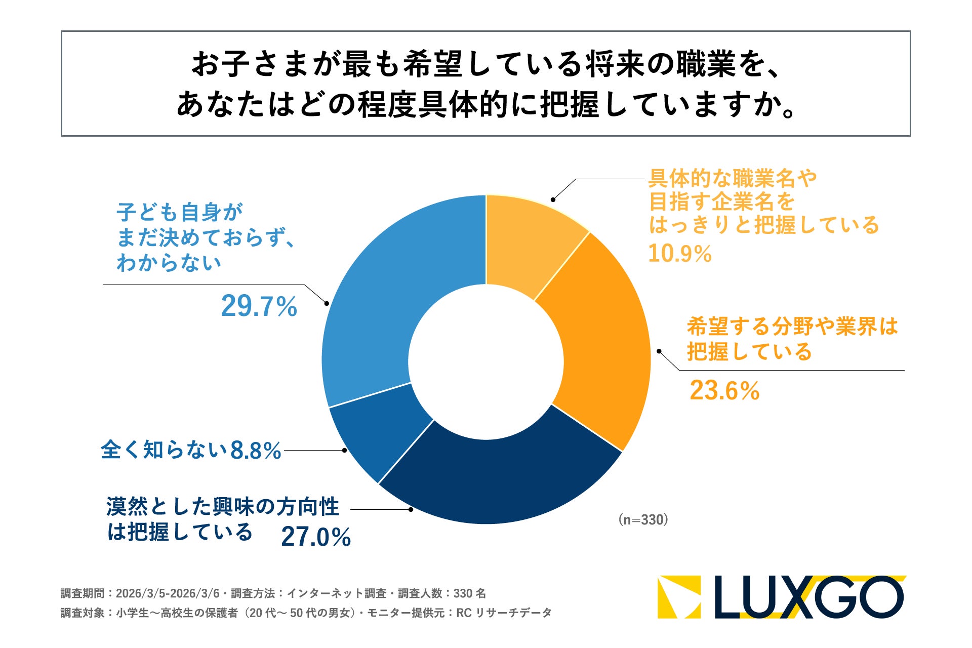 小学生~高校生の保護者の6割以上が、子どもが希望している将来について希望する分野や業界までしか把握できていない!LUXGO株式会社が「子どものなりたい職業・やりたいことに対する親世代の意識調査」を実施