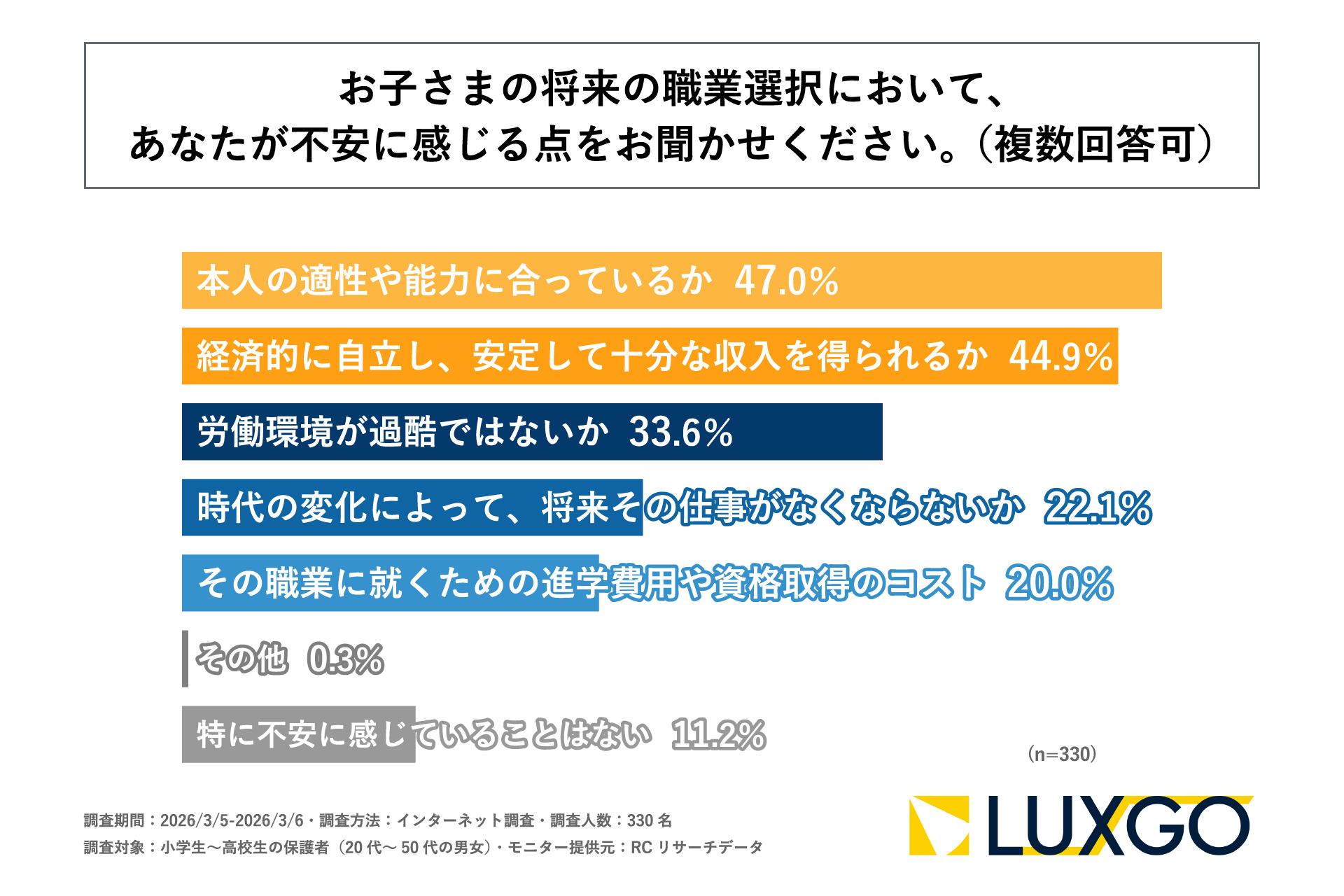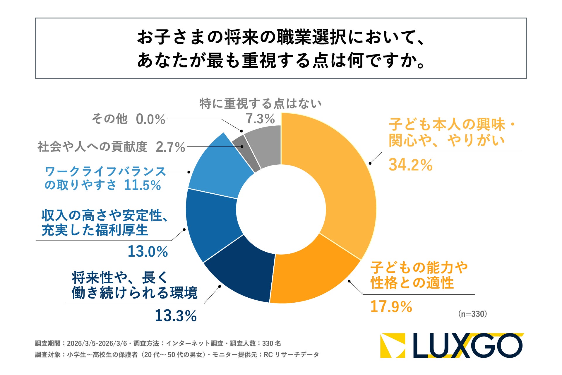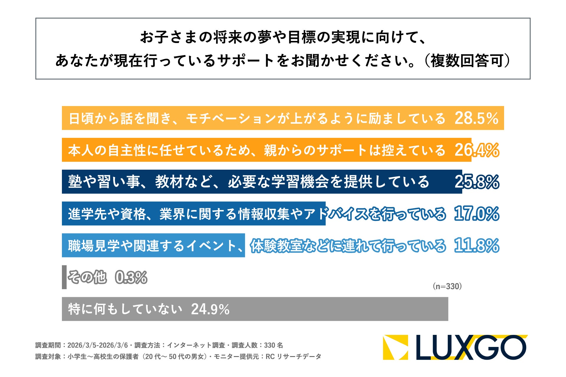 小学生~高校生の保護者の6割以上が、子どもが希望している将来について希望する分野や業界までしか把握できていない!LUXGO株式会社が「子どものなりたい職業・やりたいことに対する親世代の意識調査」を実施