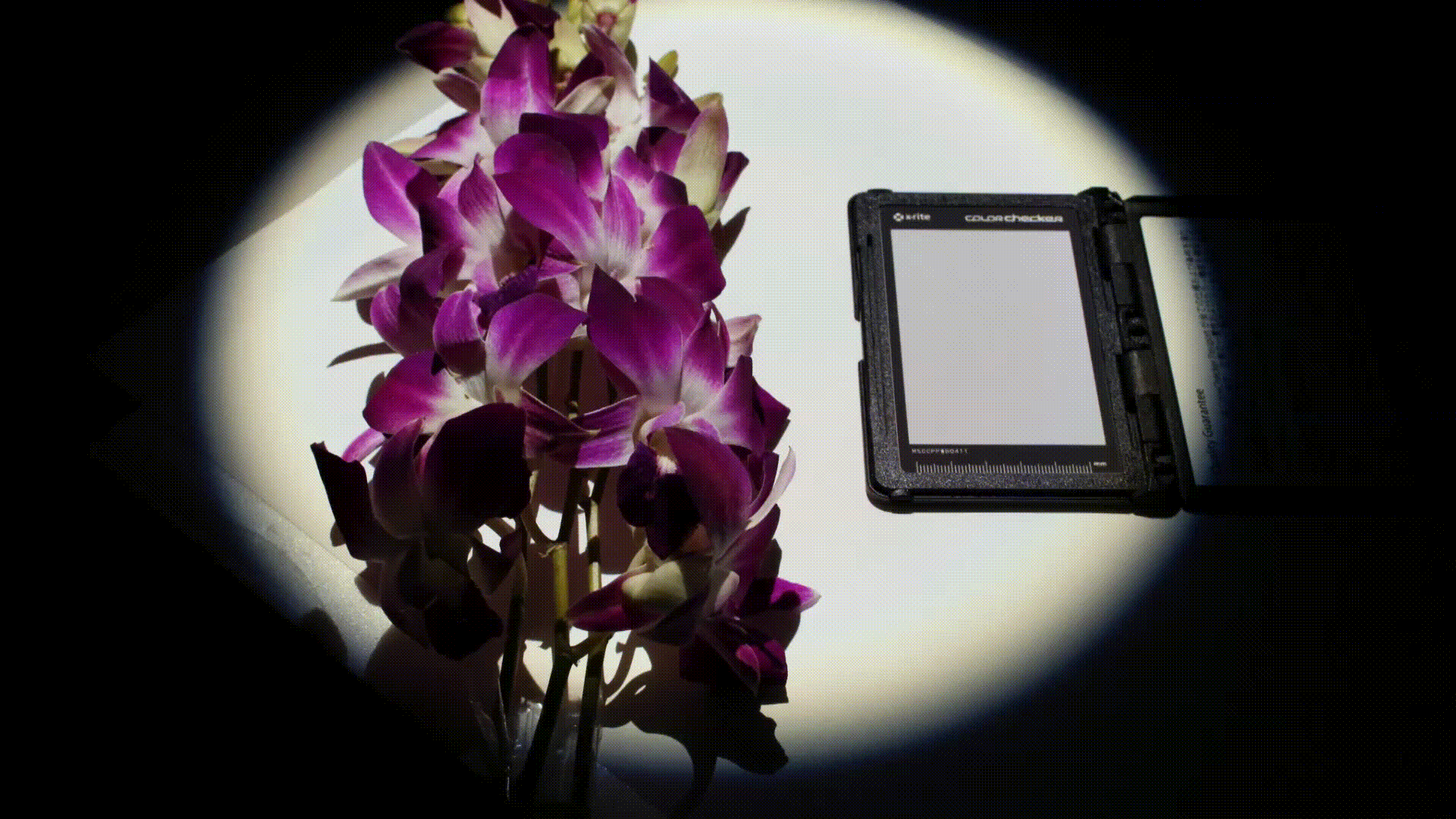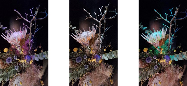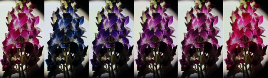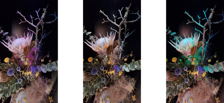 同じ作品・同じカメラ条件でも、照明の分光構成を変えることで、花びらや枝の見え方、色の印象、作品全体の雰囲気が大きく変化します。図6は、照明スペクトルの違いによる作品の見え方の変化イメージを示しています。