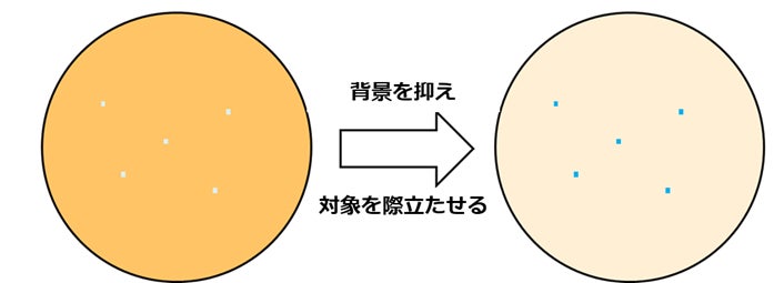 SCOIでは、観察対象と背景の分光特性を取得・解析し、それらの差異に応じて照射光の分光分布を設計します。図3は、その最適化によって対象と背景の見え方の差異を調整するイメージです。これにより、照明の白色感を保ちながら、見たい対象を相対的に見やすくし、背景を抑制することが可能になります。