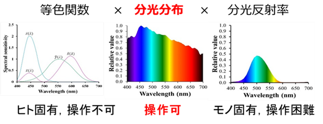 物体の見え方は、照明の分光分布、物体の分光反射率、そして人の視覚特性の組み合わせによって決まります。