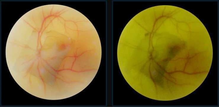 SCOIを活用することで、照明条件の最適化により、染色された組織を相対的に見やすくしたり、血液の見え方を抑えて組織の凹凸コントラストを強調したりできる可能性があります。図4は、照明条件の違いによって眼底の見え方が変化するイメージを示しています。