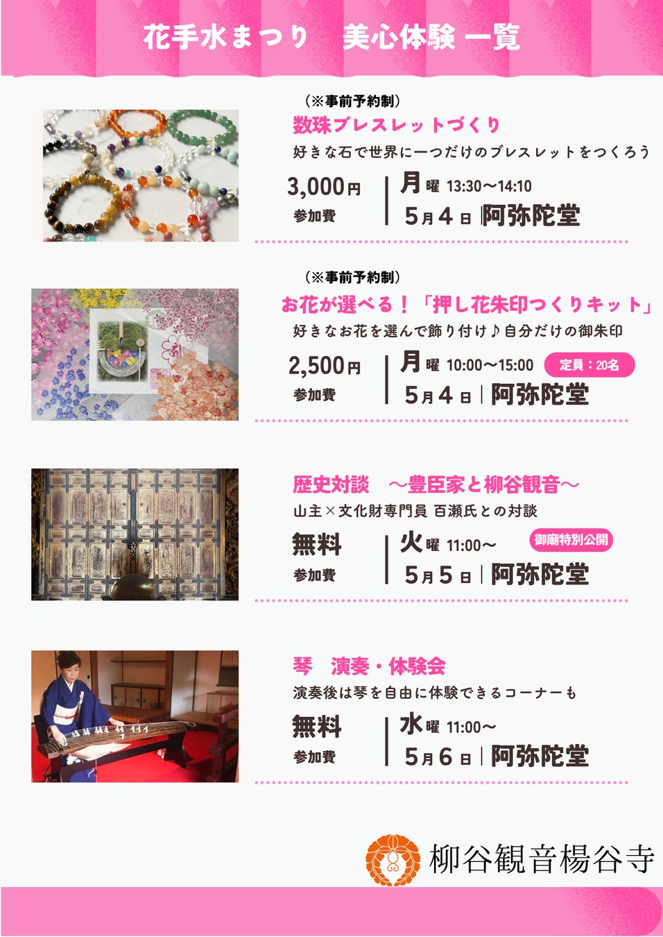 琴やクリスタルボウルの演奏、押し花朱印づくり、数珠ブレスレット作り、オリジナルアロマ作り、ミニ花手水つくりなど、五感を刺激する多彩なコンテンツが日替わりで集結します。