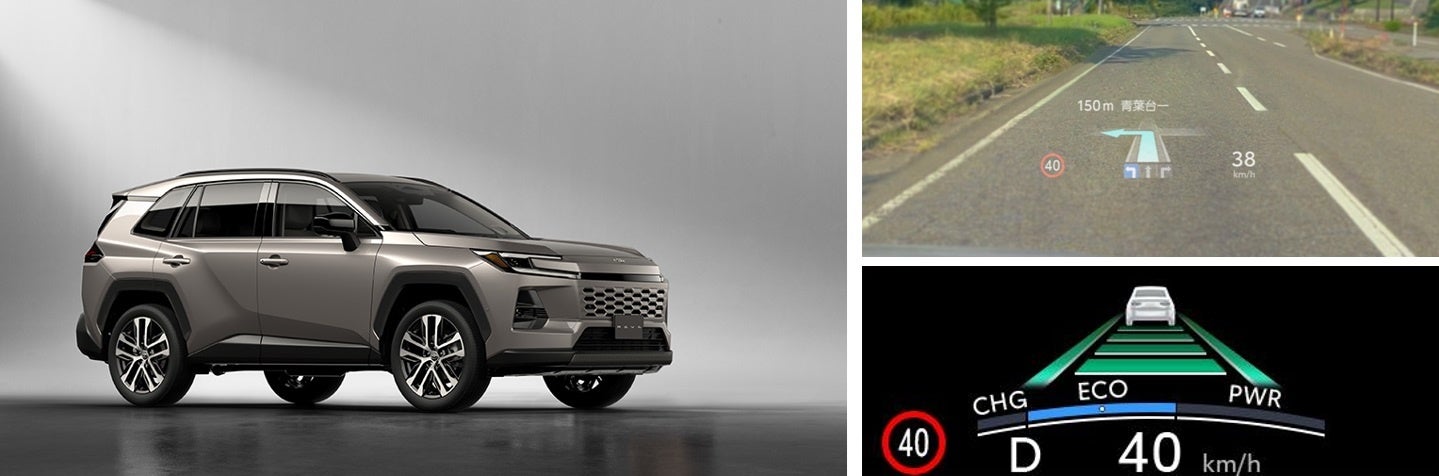 今回、日本で発売される新型RAV4には、『スロープ表示』のHUDがグレードに応じて標準搭載されます。ナビゲーション案内や歩行者・車両情報などを、従来の平面的な表示のHUDと比べ、奥行き感を持って表示できることが特長で、ドライバーの視認負荷を軽減し、必要な情報を直感的かつわかりやすく認識できるようにすることで、より安全な運転に貢献します。
