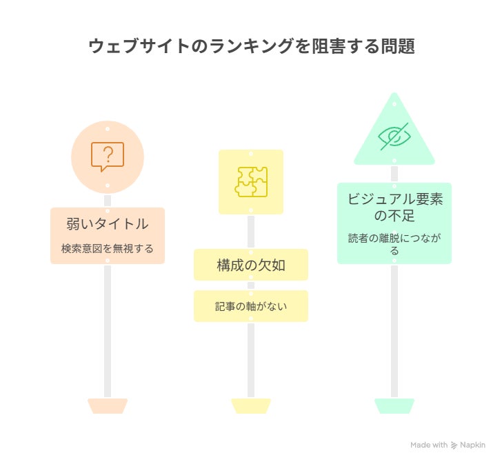 3. ビジュアル要素が不足している — 文字だけで延々と続く記事は、読者の離脱につながります。画像がない、表がない、箇条書きがない。こうした「読みやすさ」の工夫がないと、Googleのアルゴリズムも「このサイトの滞在時間は短い、ユーザー満足度は低い」と判断し、順位を下げていきます。