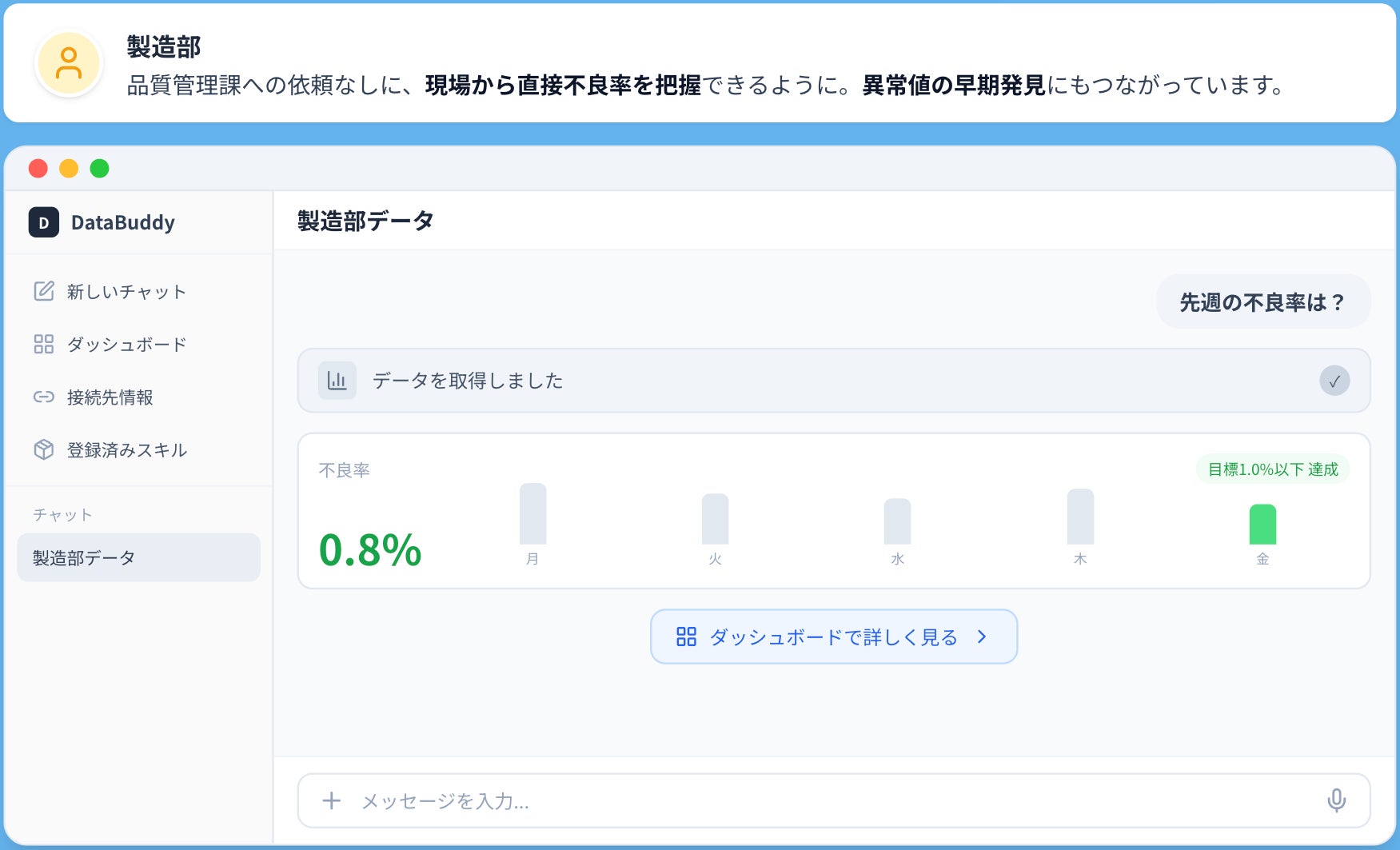 ユーザーは「質問するだけ」。難しいセットアップやツール操作の習得は不要で、現場がすぐに使いこなせます。ツールの学習コストがほぼ不要なため、全社的なデータ活用文化の浸透を実現します。