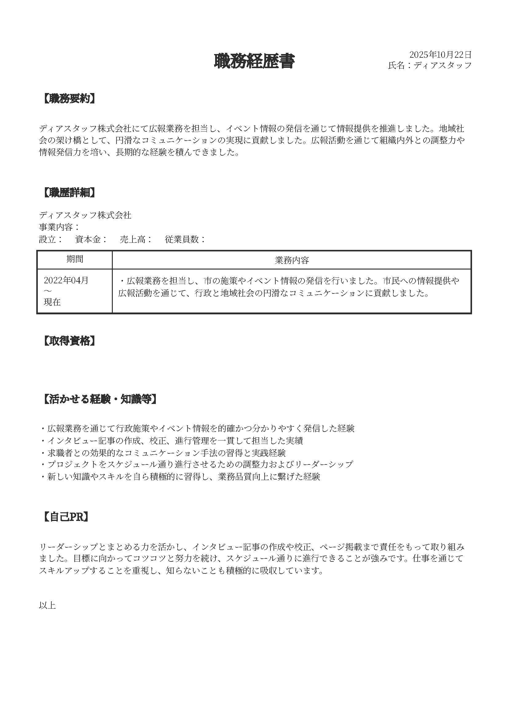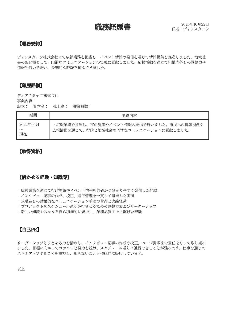 「人と ハタラク」の新しいあり方を形にするディアスタッフは、チャット形式で質問に答えていくと短時間でその人の経験や魅力が反映された履歴書・職務経歴書が自動作成される「スグれきAI」を提供することで、新しいキャリアへ踏み出そうとする人がもっと気軽に自分の可能性を試すことができる社会を実現したいと考えています。