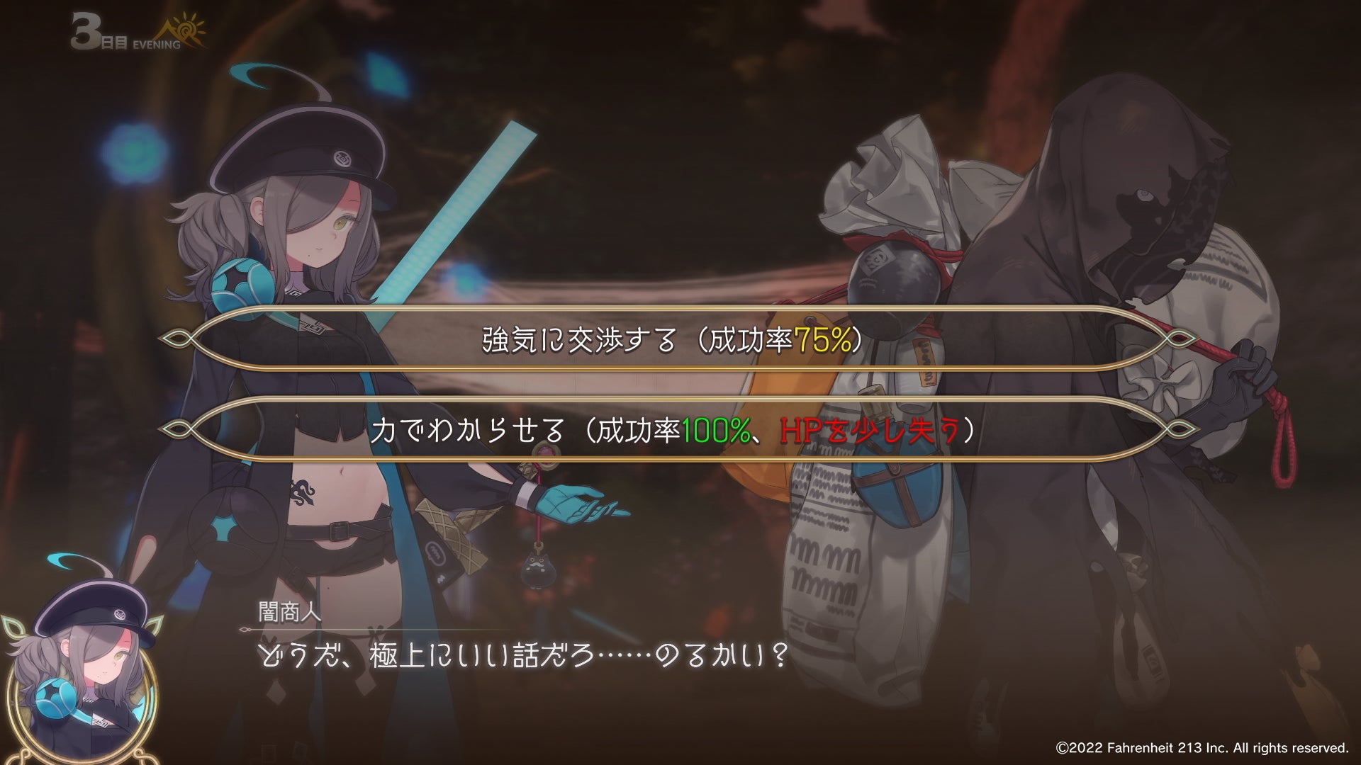 100日という限られた時間の中、プレイヤーにはその時々で常に最適な次の一手を選ぶ判断力が求められる。ときには危険を犯した交渉に臨むことや、リスクを承知の上でより難しい道を選ぶ場面など、直面する大小さまざまな試練を前に、いかにその1日をより有益なものにできるかが試される。