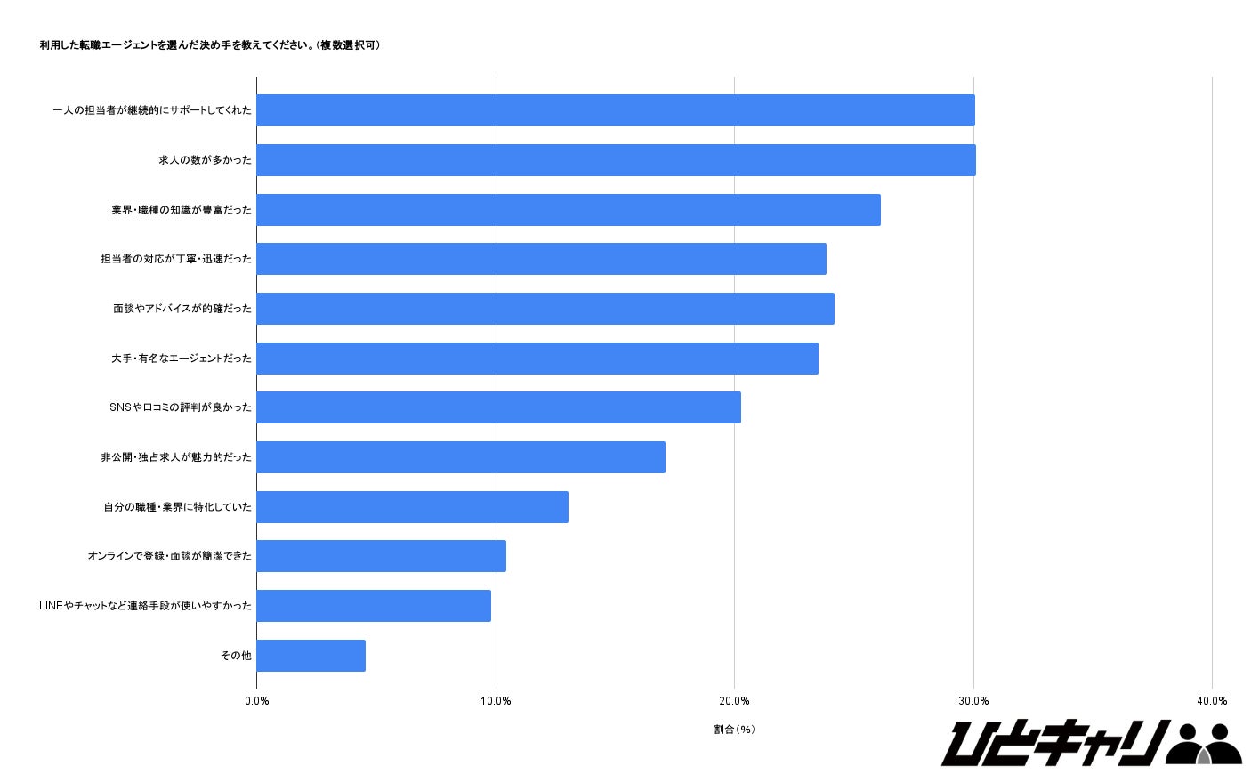 転職エージェントを選んだ決め手として最も多かったのは、「一人の担当者が継続的にサポートしてくれた」(30.1%)と「求人の数が多かった」(30.1%)という結果でした。