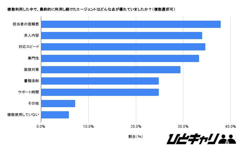 複数の転職エージェントを併用した経験者に、最終的にどのエージェントを利用し続けたかの理由で最も多かったのは「担当者の信頼感」(37.9%)でした。