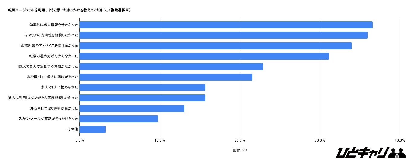 転職エージェントを利用しようと思ったきっかけでは、「効率的に求人情報を得たかった」(36.6%)、「キャリアの方向性を相談したかった」(35.9%)、「転職の進め方が分からなかった」(30.7%)など、情報収集・相談目的の利用が多いことが分かりました。