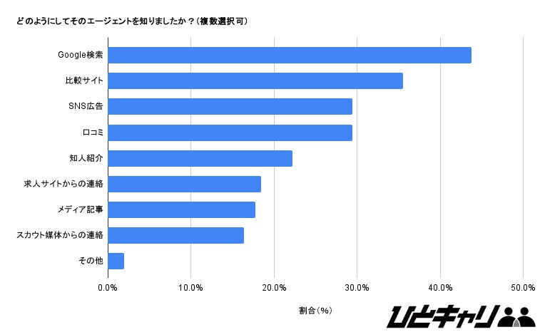 転職エージェントを知った媒体は、「Google検索」が43.8%、「比較サイト」が35.3%、「SNS広告」「口コミ」が29.4%が上位を占めてました。