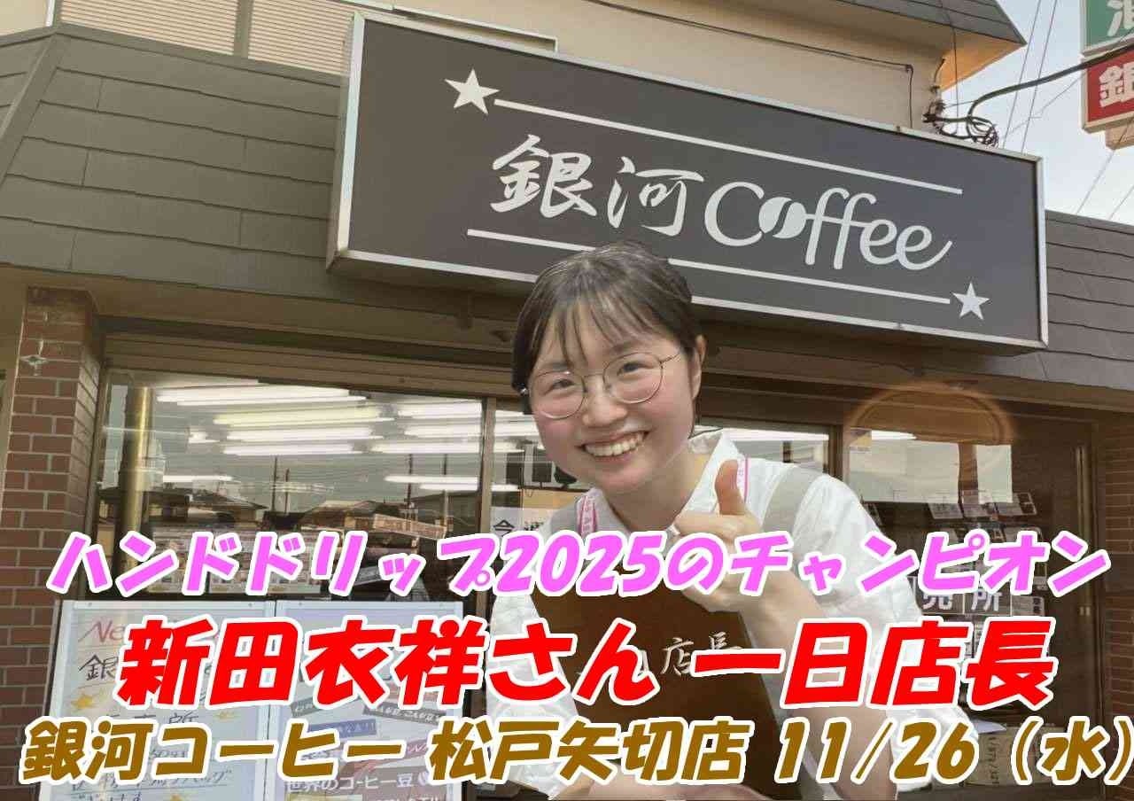 銀河コーヒー株式会社(本社:千葉県市川市、代表:山内卓也)は、2025年11月26日に焙煎所兼直売所の松戸矢切店にて、ハンドドリップ2025年度の優勝者である新田衣祥さんを一日店長に任命します。