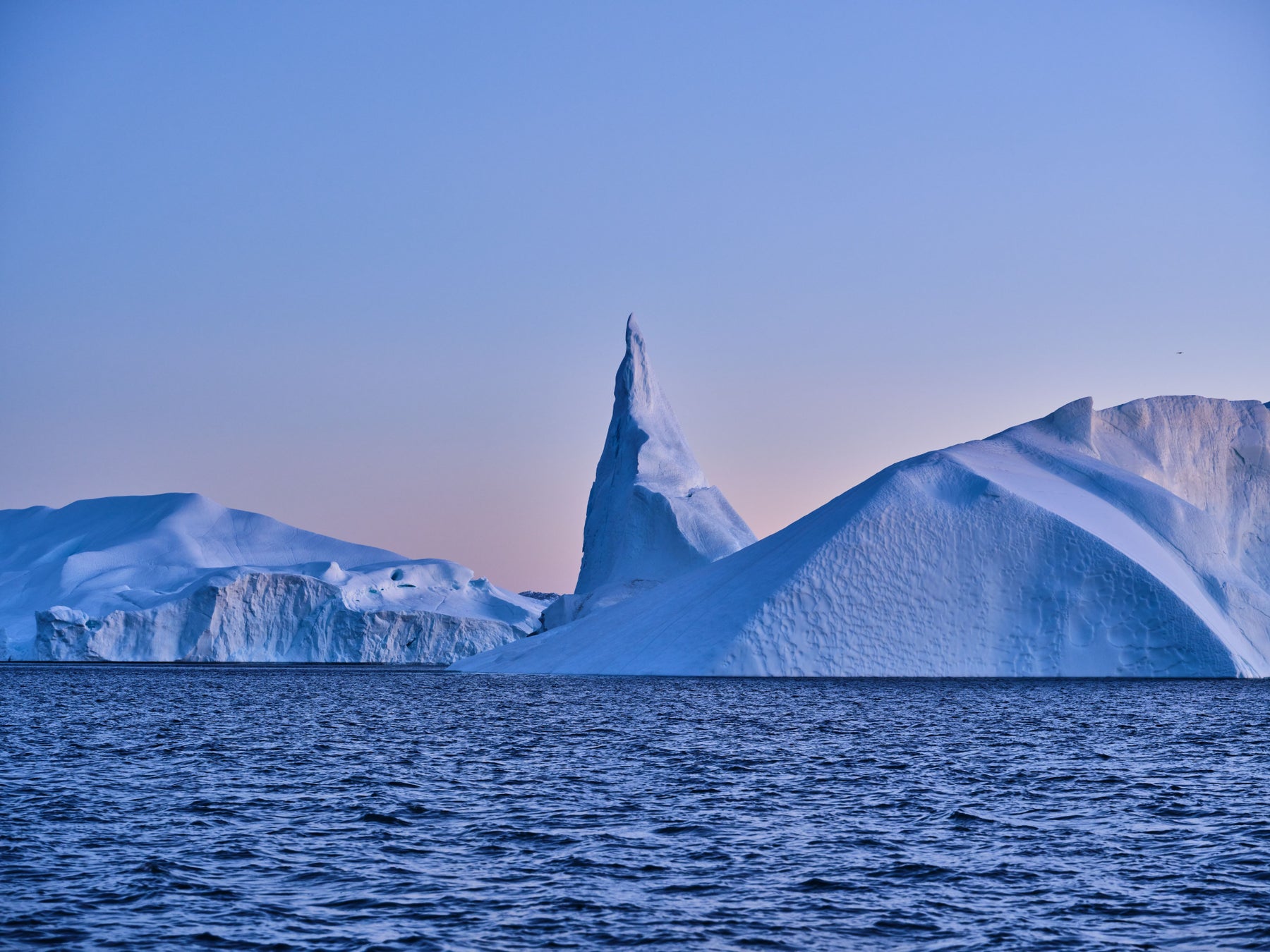 帰国を翌日に控えた夕方、空はこれまでに見たことのないほど赤く染まりました。ネイビーブルーの雲と水平線の狭間で帯状に輝く夕陽。その光を受け、海上に浮かぶ氷山はブルーとピンクの色彩を纏い、幻想的な表情を見せました。撮影を終え、暗闇の中を下山する途中、腰塚氏が辿り着いたのは、19世紀末から20世紀初頭に使われていたイヌイットの古い墓地でした。無数の十字架のシルエットと沈みゆく夕陽を前に、この地で自然とともに生きてきた先人たちの存在を強く感じたといいます。