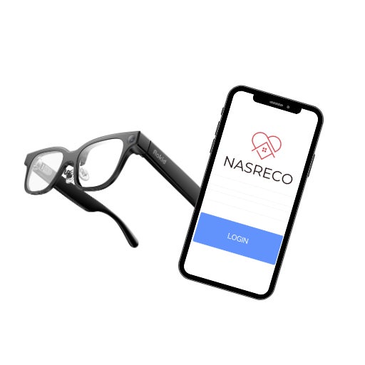 スマートAIグラス「NASGlass」は、同社開発の「NASRECO」と利用すると、音声起動・記録・写真撮影・インカム機能・ナースコール受信など多機能を利用できる。