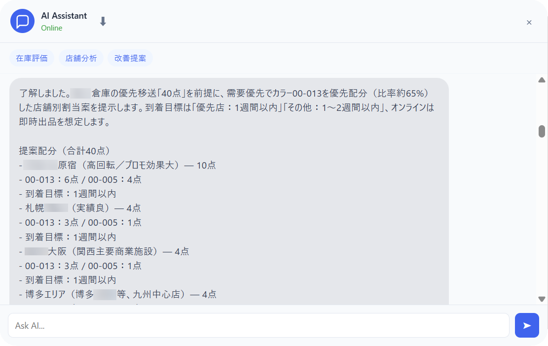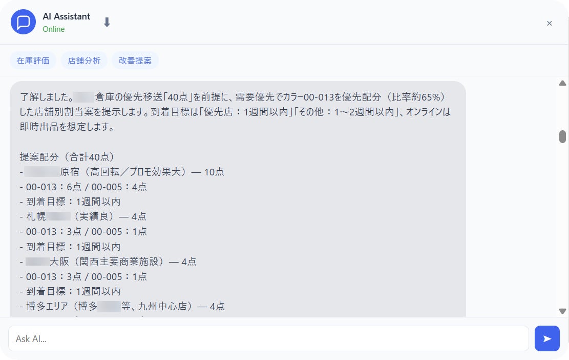 本機能は、売上・在庫データの分析結果を、実務判断や具体的な業務アクションへつなげる価値を提供します。