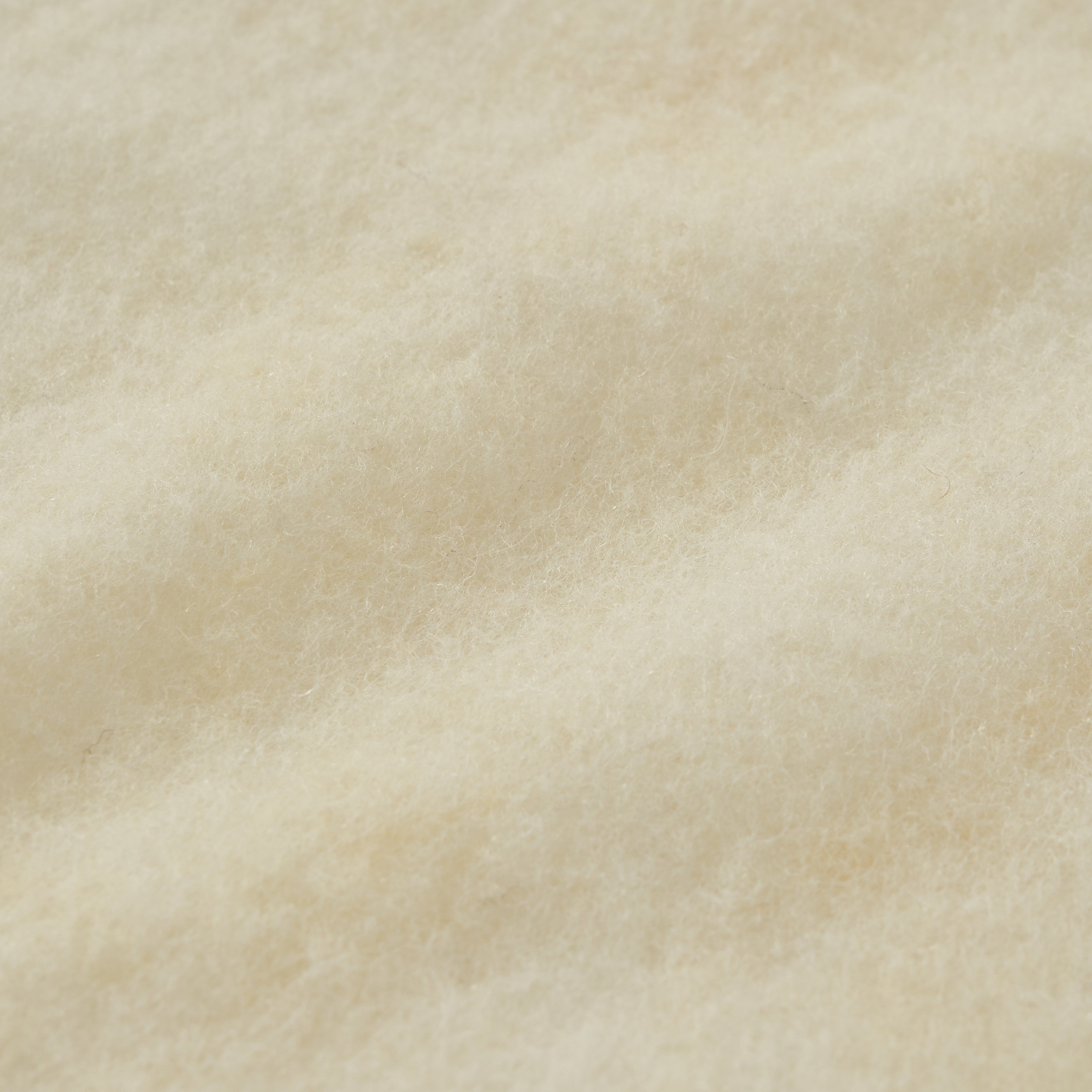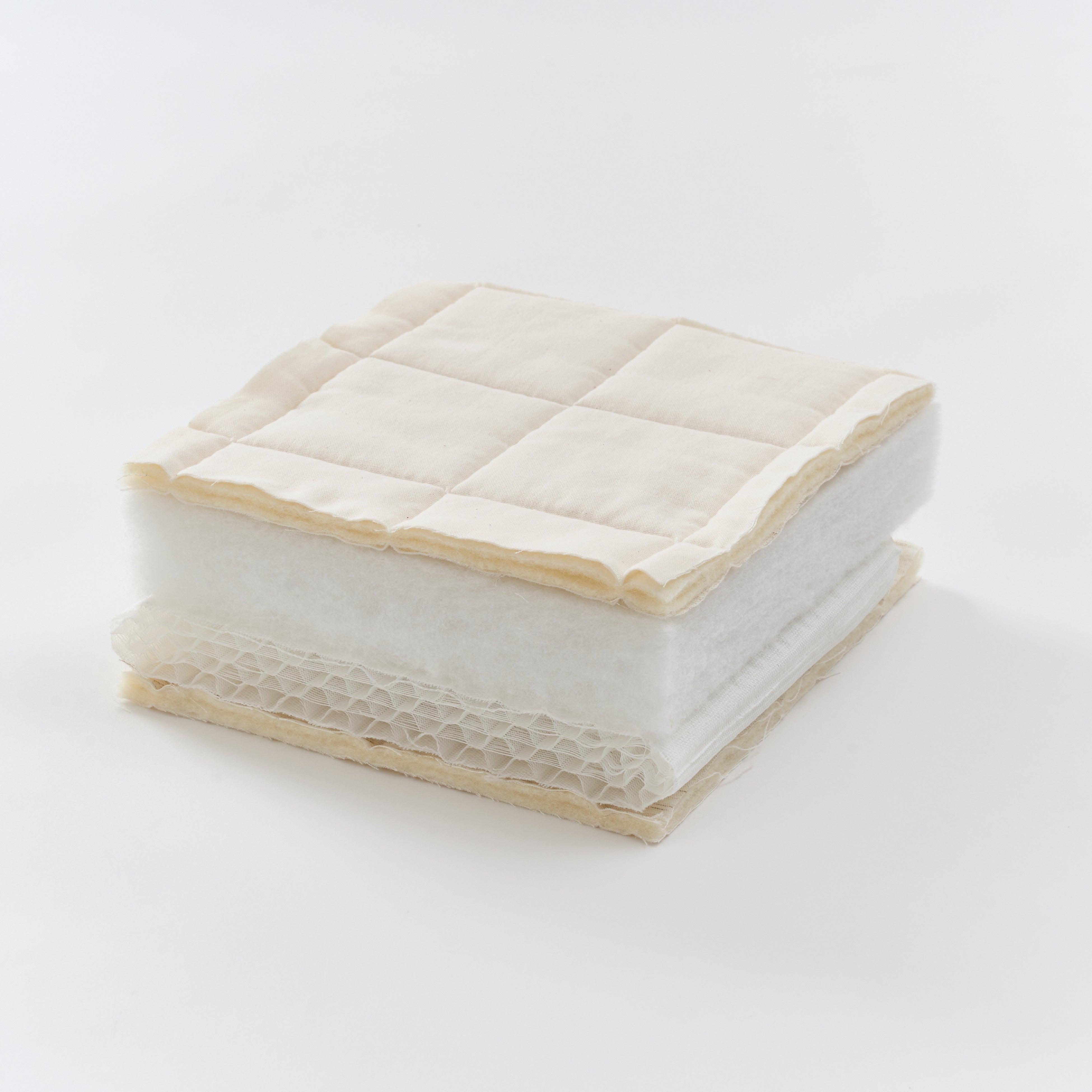 ウールをフェルト化させる独自のニードルパンチ加工により、通常のカード綿と異なりボリュームの低下(へたり)を抑えつつ、高い調湿機能を維持。