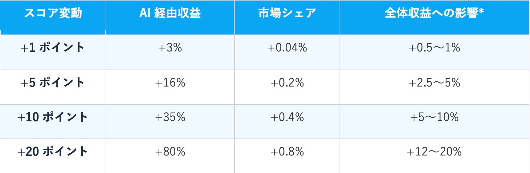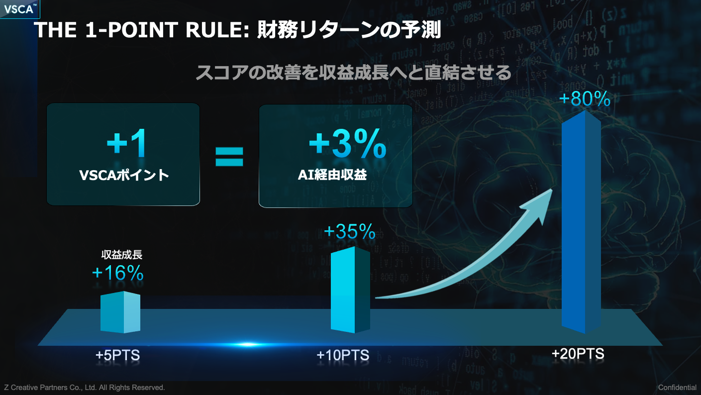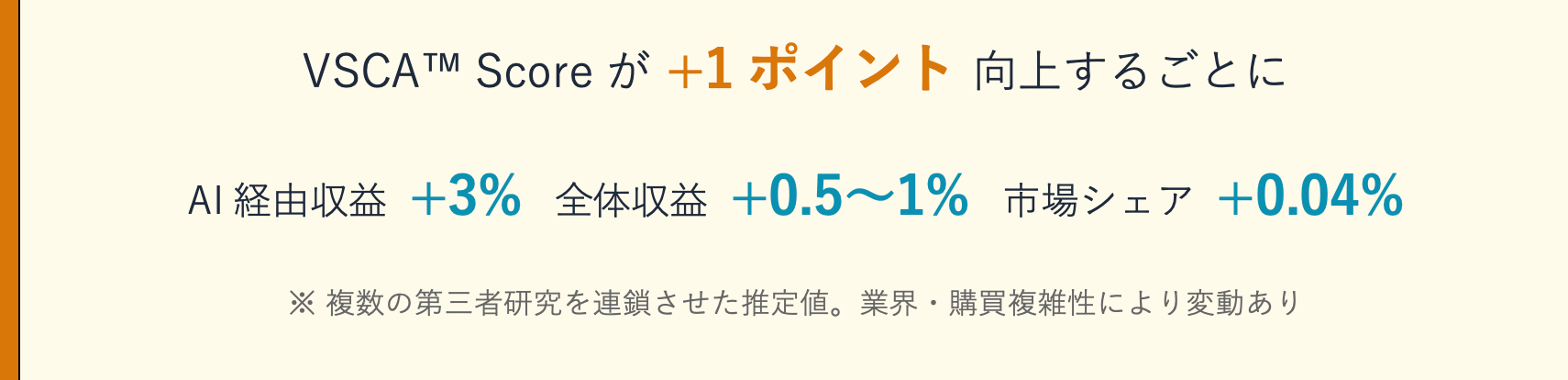 さらに、単なるスコアリングに留まらず、VSCA™ Scoreの改善が売上・市場シェアにどう直結するかを示す「統合収益モデル」も併せて公開します。第三者研究に基づくエビデンスにより、「VSCA™ Scoreが1ポイント向上するごとに、AI経由収益が約3%増加する」という関係性を試算しています。